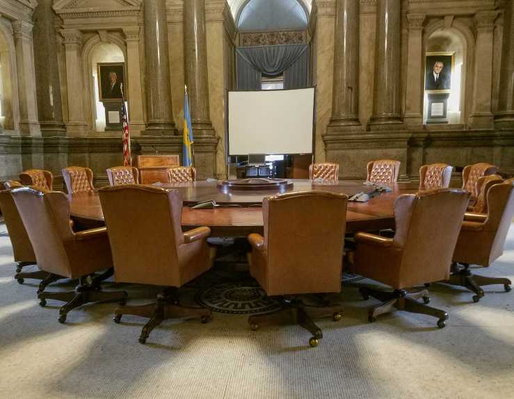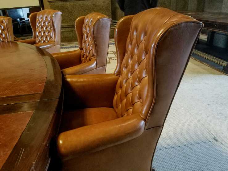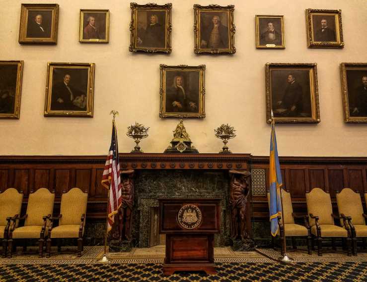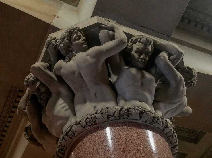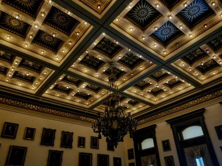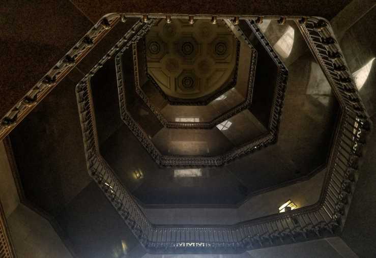 With its three-story inlaid walnut bookshelves and magnificent ceiling, the East Room was designed as a treasury for Pierpont Morgan’s remarkable collection of rare printed books. The sixteenth-century Netherlandish tapestry over the mantelpiece depicts avarice, one of the seven deadly sins, personified by the mythological King Midas. Two staircases, concealed behind bookcases, provide access to the balconies. Paintings by H. Siddons Mowbray adorn the upper reaches of the room, and the signs of the zodiac are depicted in the ceiling’s hexagonal spandrels. (Morgan was a member of an exclusive dining club that admitted only twelve members at a time—one for each sign of the zodiac—and the arrangement of the signs in his library’s ceiling may carry a hidden meaning related to key events in his personal life.) Allegorical depictions of the arts and sciences alternate with portraits of figures from Socrates to Michelangelo, identifying the library as a place for the preservation of art and ideas.