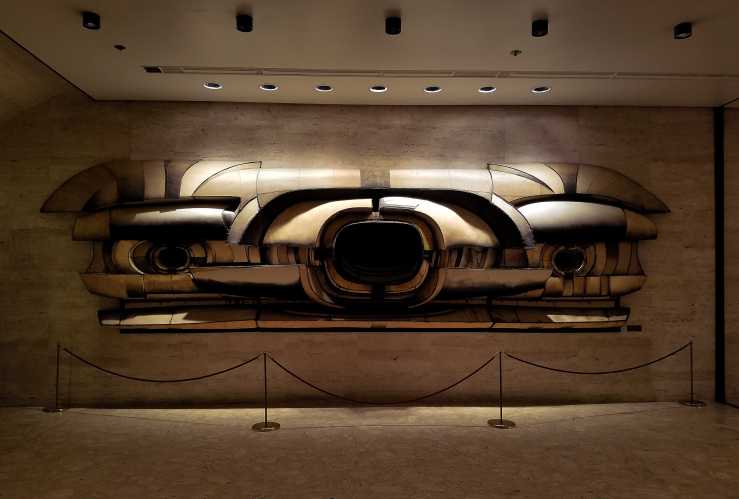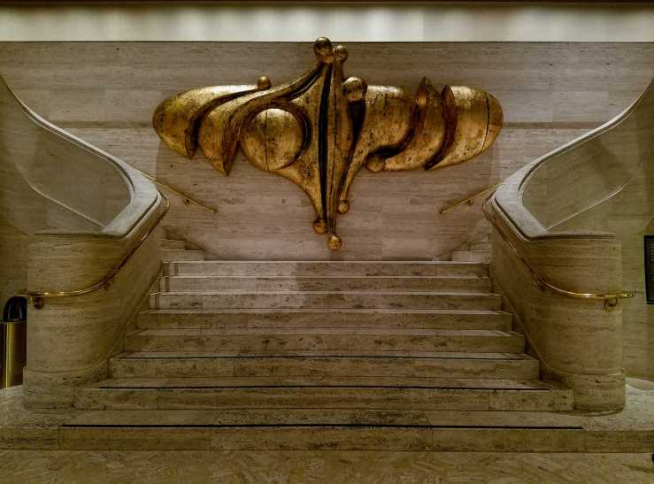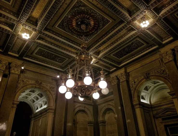 In Morgan’s day, visitors to the library passed through a pair of monumental bronze doors into a rotunda replete with opulent detail: variegated marble columns, an ornately patterned floor, and fine mosaic panels that line the curved walls. The ceiling paintings, by American artist H. Siddons Mowbray (1858–1928), depict three of the major literary epochs represented in Pierpont Morgan’s collections—the ancient world, the Middle Ages, and the Renaissance.