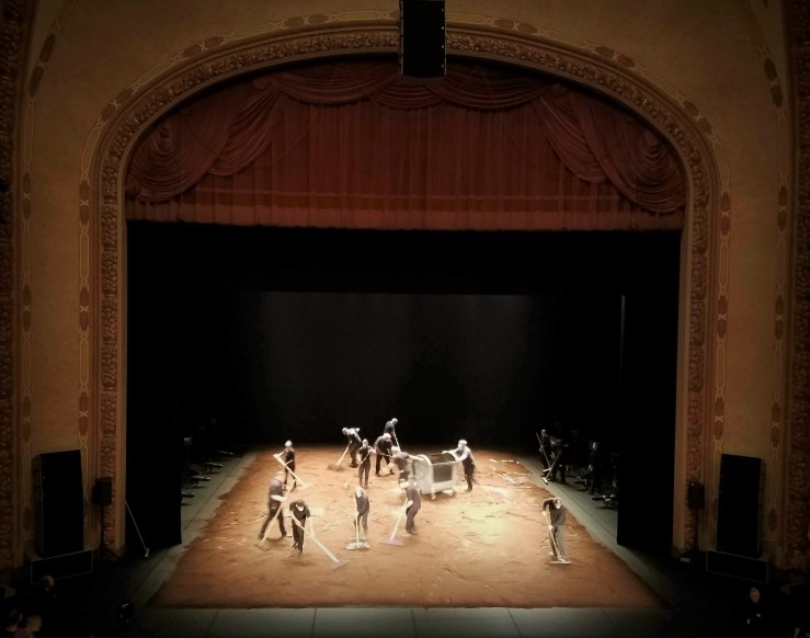 Images show the transformation of the stage from a café, in which figures dance dreamily to the music by Henry Purcel, to a dirt field where dancers perform a wild ritualistic routine in honour of spring – a transformation that earned the crew their very own, heartfelt applause; alternating with images of one of the City’s most iconic structures, at dusk.