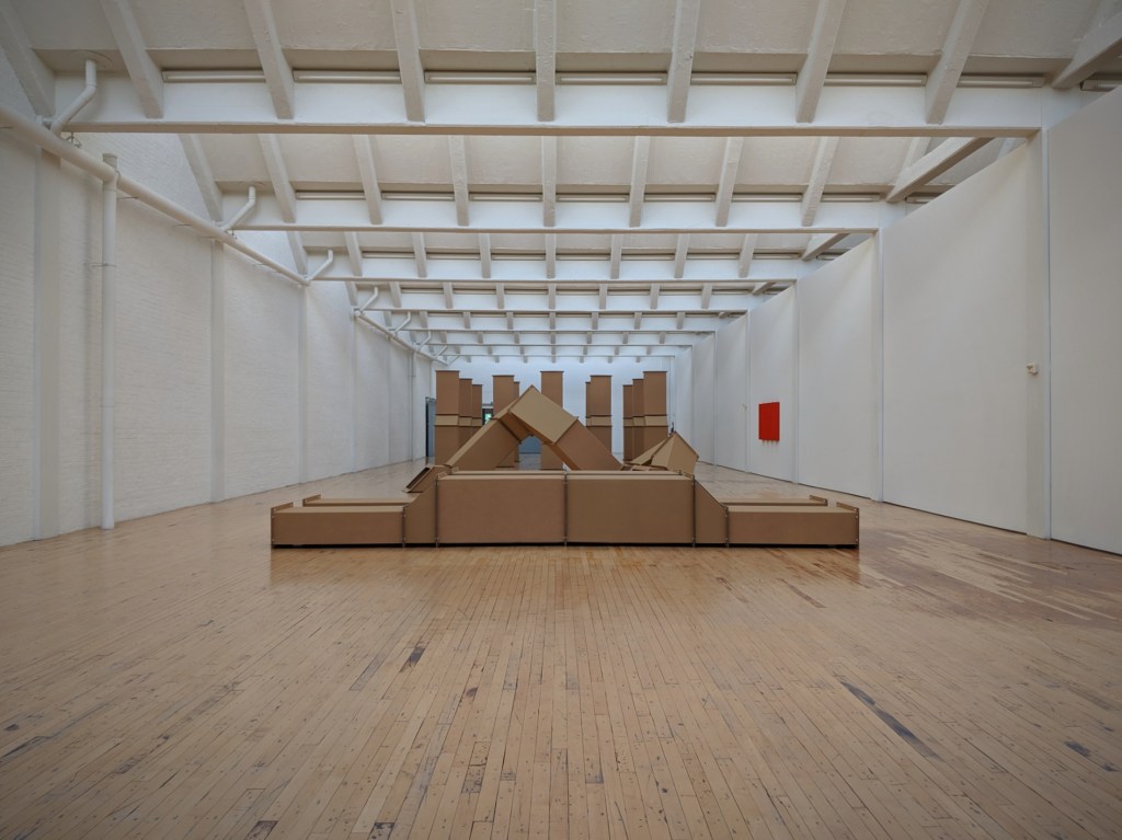 Mass production and variability are also at the heart of Posenenske’s subsequent works. Series D consists of six shapes in galvanized sheet steel. While these elements resemble standard ventilation ducts, the tubes are nonetheless custom-made according to the artist’s instructions and sketches. Shortly after conceptualizing Series D, Posenenske created Series DW, a variant with only four shapes produced from lightweight corrugated cardboard. A ready-made material, cardboard nonetheless represents a departure from the aesthetics of the steel tubes, which are in effect almost indistinguishable, in form and provenance, from the functional elements that they refer to. Larger but more manageable than their sharp-edged steel counterparts, the Series DW components are also easier to manipulate.” [source]