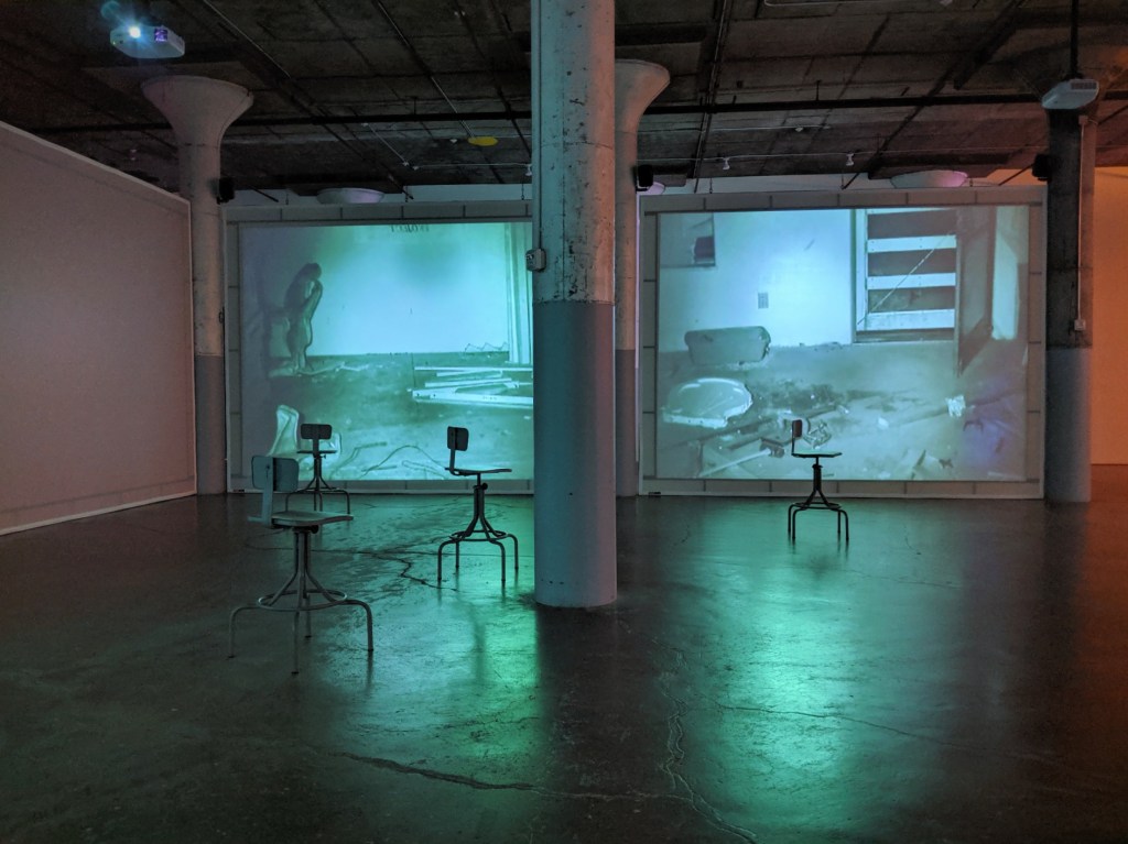 You’ll need to sit down if you are to watch Bruce Nauman’s Mapping the Studio I (Fat Chance John Cage) (2001), where six projectors each display six hours of footage that track the activities of mice, cats, and other creatures as they run through the artist’s work space.