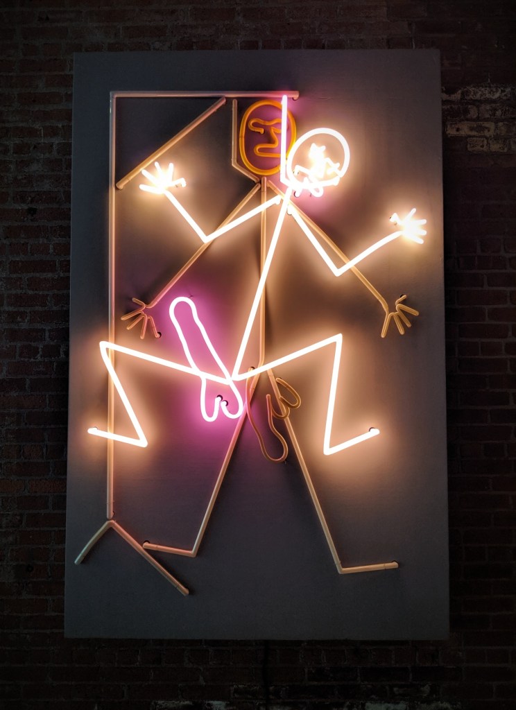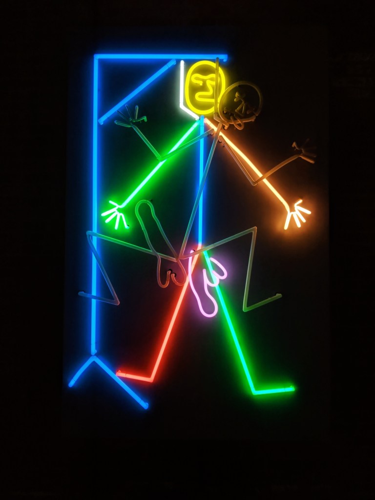 The reference to John Cage, in case you were wondering, is from an earlier work of Nauman’s, a telegram sent to the London gallerist Anthony d’Offay in response to a request for a work related to Cage. The telegram was misunderstood and was not exhibited; still intrigued by the expression ‘fat chance’, Nauman decided to reuse the words. [source: the Tate]