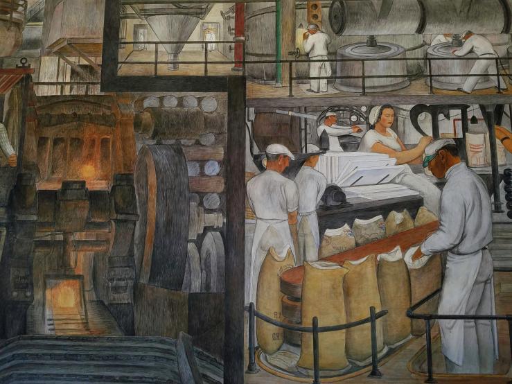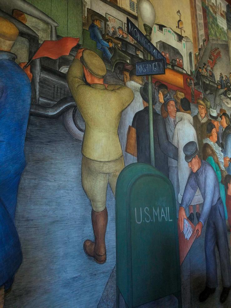They depict life in California during the Depression, with emphasis on the theme of industry and commerce and distinctive touches of leftist political ideas, clearly evident; like on Bernard Zakheim’s “Library” which depicts fellow artist John Langley Howard reaching for a copy of Karl Marx’s ”Das Kapital” (spelled here ”Das Capital”). Touches one is familiar with in Europe, but rather unusual in the States. Perhaps it is true, after all, San Francisco may well be a very European city.
