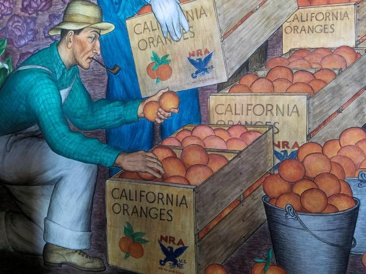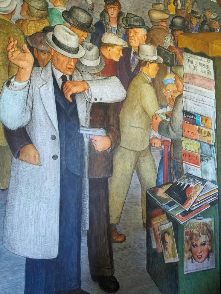 So what if the line went round and round, forming a complete circle at the base of the tower. There was so much to see during the hour we waited to reach the lift that, for once, I didn’t feel the pain. For the entire ground floor is adorned with floor to ceiling murals painted in 1934 by a group of artists employed by the Public Works of Art Project, a precursor to the Works Progress Administration (WPA).