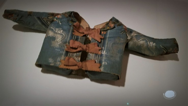 Embellished infant’s booties of this type would have been worn at a christening or some other important event. The same baby girl who wore this pale blue kid leather pair also wore a matching pair in pink (not shown), suggesting that the code of blue for boys and pink for girls was not yet firmly established at the turn of the twentieth century. Historically, pink had been favoured as a more vigorous and thus ”masculine” colour, suitable for boys and blue as a passive and thus ”feminine” colour, suitable for girls.