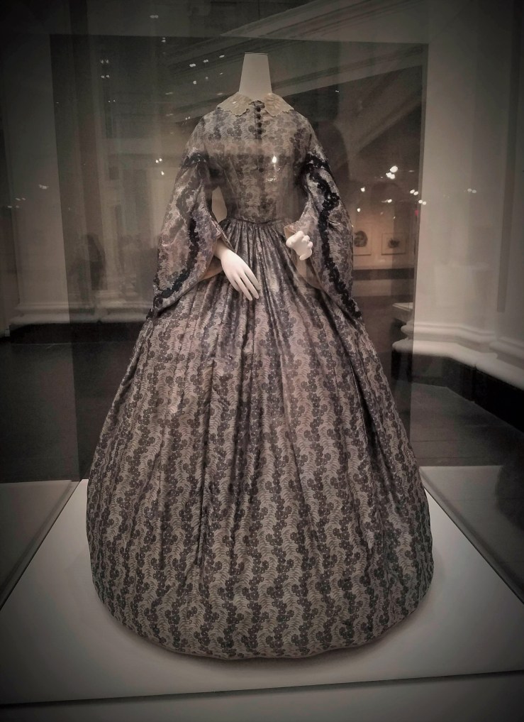 Sarah Elizabeth Fish (1824-1901) of Waldoboro, Maine, wore this elegant full-skirted dress, with stylish pagoda sleeves and a blue and silver jacquard pattern, as her wedding dress. The blue colour was probably achieved using an early synthetic organic dye. It was not uncommon for women in eighteenth- and nineteenth- century America and Europe to wear wedding dresses in colours other than the white that is now customary, and to wear them again after the wedding for other special occasions. Blue was a popular wedding dress colour for its strong association with loyalty, purity and virtue; this is echoed today in the traditional ”something blue” that brides may wear.