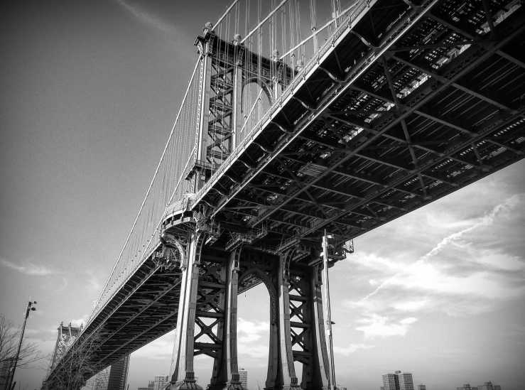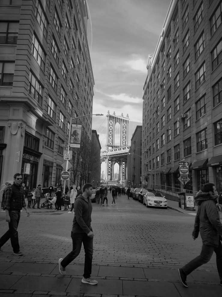 A walk, long overdue. Surely, we must have been the only newly arrived couple who waited six months to walk Down Under Manhattan Bridge Overpass – DUMBO to friends. But here we were, on a Sunday afternoon in February, mild and sunny and glorious, with our take of the iconic Manhattan Bridge seen from Washington St. and, true to word, from Down Under.