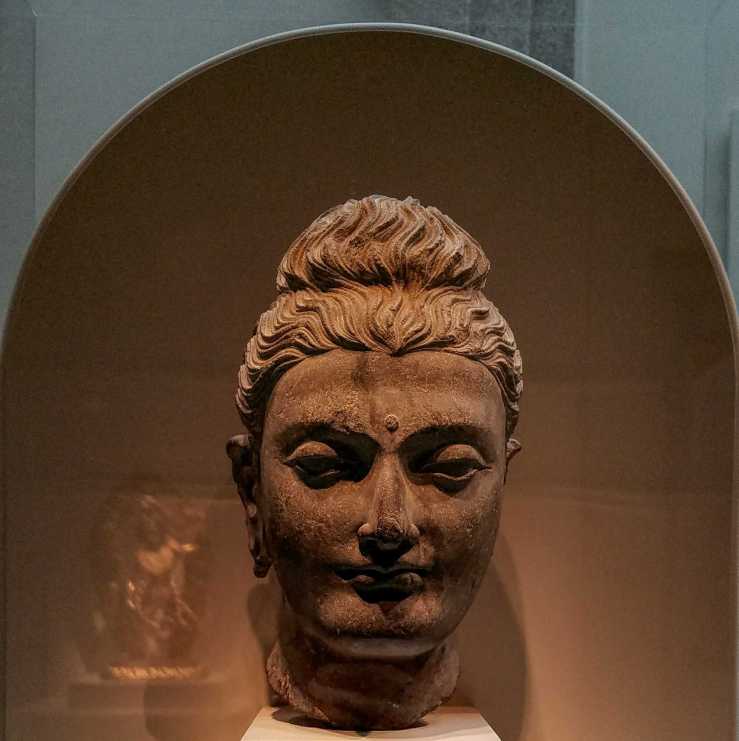 A very early image of the Buddha, this serenely beautiful head was once framed by a halo and joined to a complete figure. The Buddha’s downward gaze conveys that he is meditating. His cranial bump (ushnisha), which signifies transcendent wisdom, and his forehead dot (urna) are marks of his perfected nature. The sculpture was created for a monastic complex in ancient Gandhara, a region that now spans Pakistan and Afghanistan. In the third century, Gandhara was a crossroads that united the Greco-Roman world with India, and the Buddha’s wavy hair recalls classical images of Apollo.