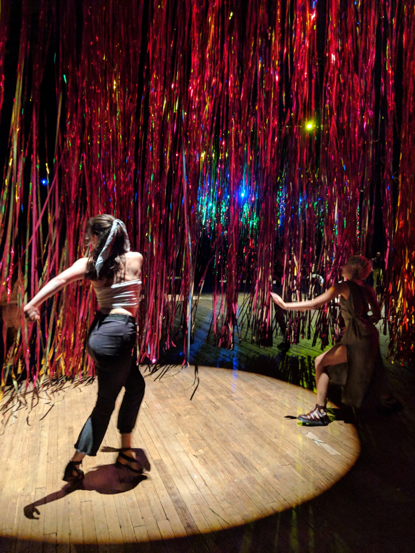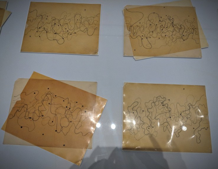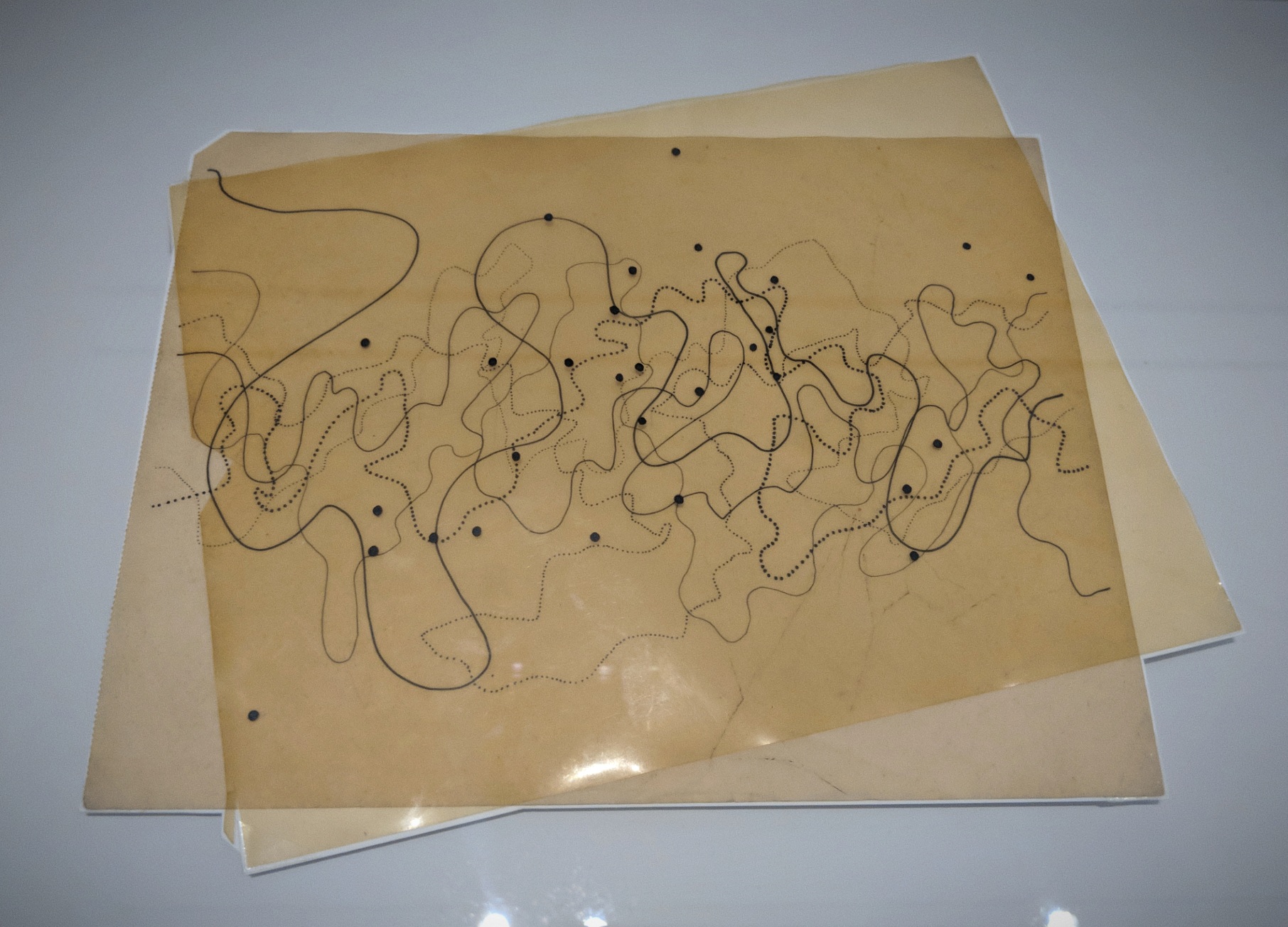 In his workshops, Robert Ellis Dunn presented his students with Cage’s score for ”Fontana Mix” and asked them to use it as inspiration for a performance. The score instructed performers to layer transparencies containing lines and dots over a grid to create a random visual arrangement, with they then interpreted using a variety of movements and actions. This exercise exposed the students to chance operations, a composition technique popularized by Cage that introduced randomness into the art-making process.