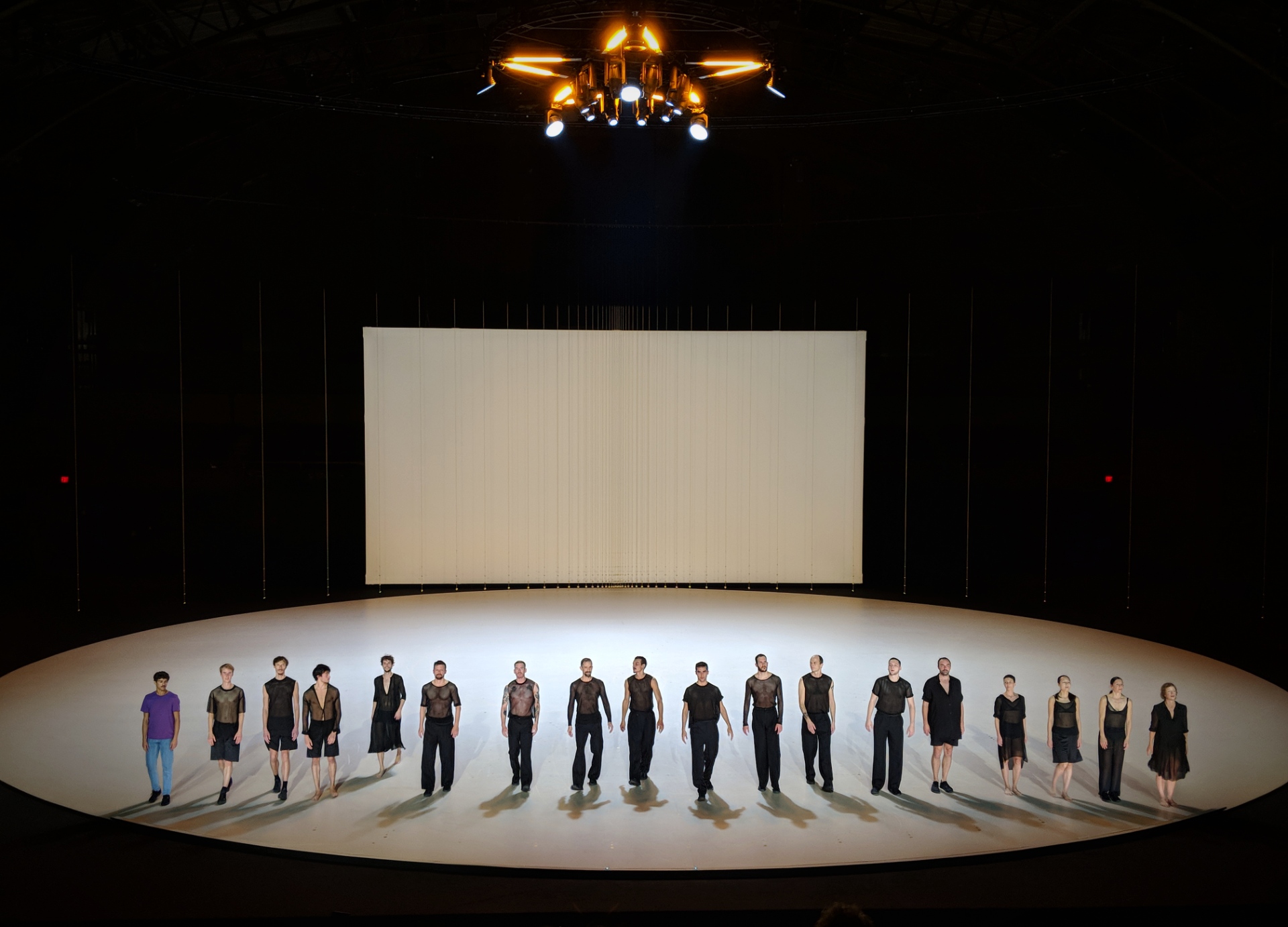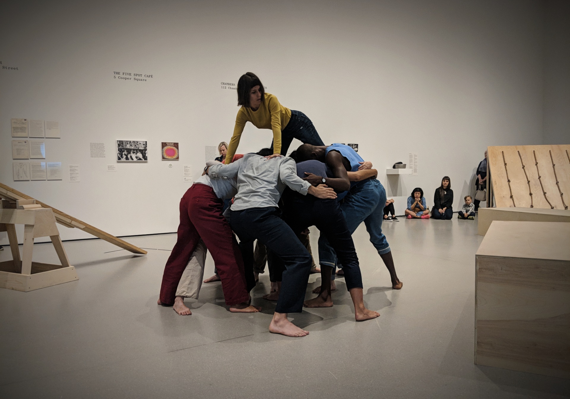 Huddle is part of Simone Forti’s Dance Constructions (1960-61), a continually shifting mass of bodies. Seven to nine performers create a solid base and take turns climbing over the group. In doing this, they create a sculptural form Forti has often described as a mountain.