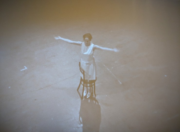 Geranium was set to the sounds of a championship football game, complete with sports commentators describing the action on the field, to which Childs added her imitation of sports broadcasting and intervals of music. Using the tape as a score and its sounds as cues, Childs interacted with objects including a wooden pole, a tinfoil scrap, a hammer and a pound of soil. She used a hammock to support her weight as she performed, in slow motion, the movement of a football player who – according to the broadcast – raced toward the ball, stumbled and fell.