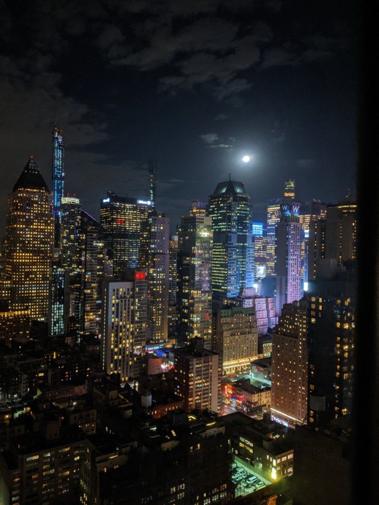 Schools, restaurants, gyms were closed. There was a gradual lockdown until March 20, when all non-essential workers were ordered to stay at home, and the City went on PAUSE. Shut in our glass tower, we spied on the Port Authority traffic (significantly reduced, yet there were still buses running), communicated with signs on windows and a 3-minute clapping every evening at seven (to cheer the frontliners, but also a get-together of sorts, as if to reassure each other we weren’t alone), learned how to work on Zoom, a platform no-one had ever heard of pre-Covid, but was now quickly becoming our new workplace.
