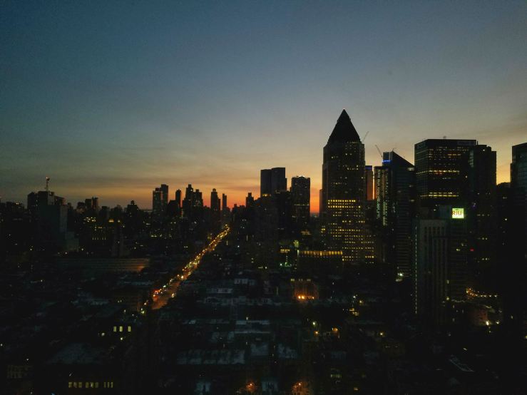 The red brick of Charles Scribner’s Sons building is bathed in a warm blood orange colour.