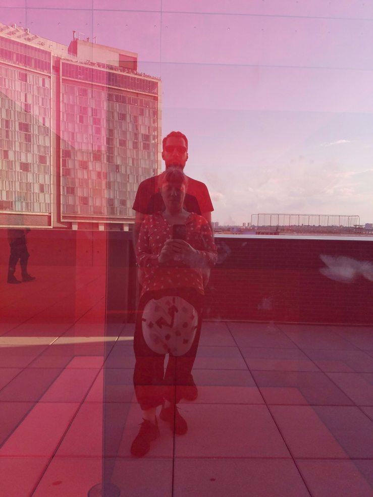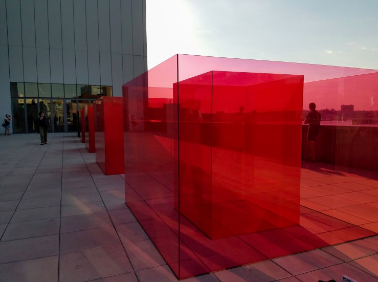 Blending into the red candy palette of Larry Bell’s Pacific Red II, a work consisting of six laminated glass cubes installed in one of the Whitney’s terraces. Each box enclosed another, their multiple surfaces reflecting warm shades of red and pink light which – inevitably – made it an instant hit with photographers and other urban species of instagram.