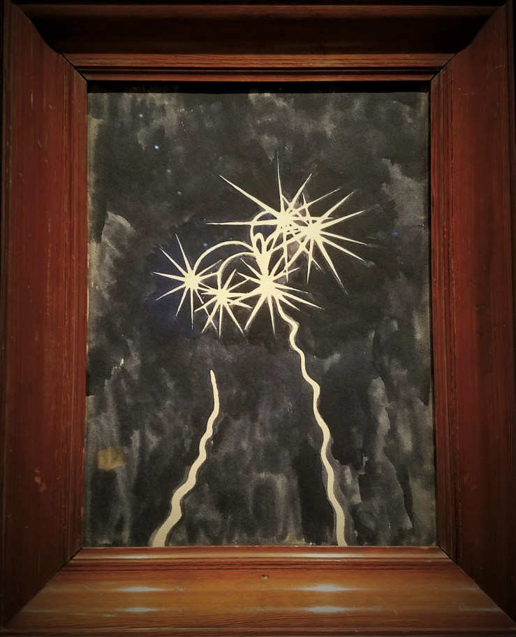 Spilliaert served briefly in the Belgian civil guard after the German invasion. A pacifist by nature, he was greatly affected by the violence of war. Here, he depicts a deep blue sky illuminated by the flare of rockets, an image witnessed by both soldiers and civilians in occupied territories. The artist concentrated not on the rockets’ violent potential but on the graceful forms they generate and their resemblance to stars and comets.
