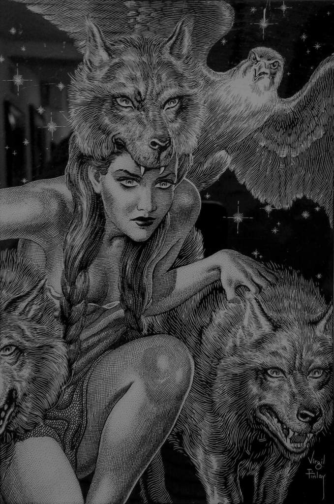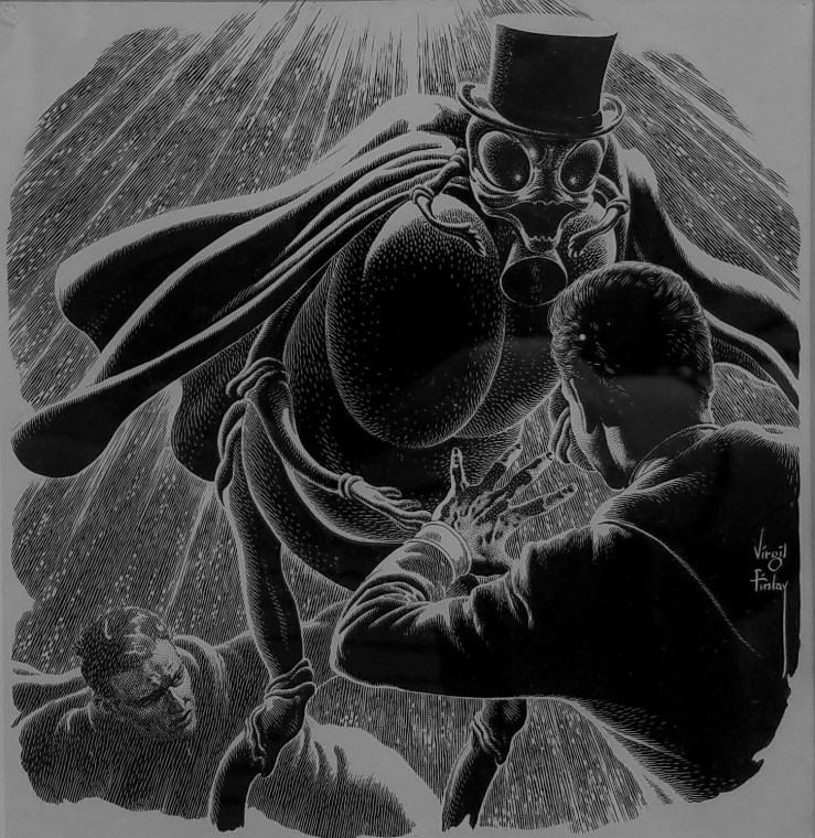 ”Instead of the typical pen and ink or carbon pencil drawings produced by most pulp illustrators, Finlay used a unique technique combining scratchboard—in which a clay-covered board is coated with black ink and the artist scratches away white lines from the black using a sharp blade—with intricate pen cross-hatching and an astonishingly painstaking method of creating tones called stipple.