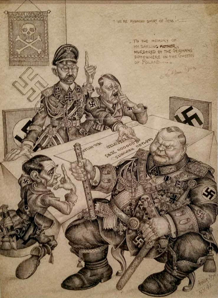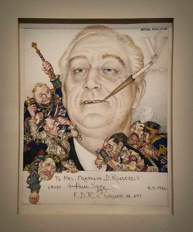 Arthur Szyk fought the demons of WWII in his own creative way, by focusing on political cartooning and producing works that were published as magazine covers, reproduced as posters, and exhibited in art galleries. Among the many admirers of his work during this period was Eleanor Roosevelt, who wrote in her newspaper column My Day: “In its way [Szyk’s work] fights the war against Hitlerism as truly as any of us who cannot actually be on the fighting fronts today.” [source]