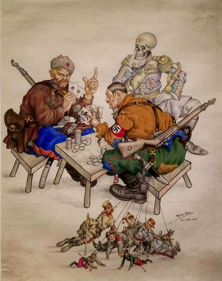 Szyk anticipated the US entry into WWII and Hitler’s eventual downfall in this depiction of a decorated figure of Death observing a dangerous poker game between Hitler and ”Ivan”, a pre-Soviet Union Russian leader. Gambling with the fate of the world, Hitler’s cards represent his alliance with Italy, Japan and Vichy France. Ivan’s hand includes the US and Great Britain. Seven puppets, the collaborating leaders of Hungary, Finland, Japan, Italy, Vichy France and Spain, hang from Hitler’s belt. The painting appeared on the cover of Collier’s on November 1, 1941, one month before the US entered the war.