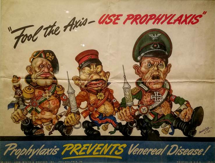 Offset lithograph. Here, Szyk characterizes Mussolini, Hirohito and Hitler as venereal diseases, offering perfect incentive to stay healthy and fight in the war effort.