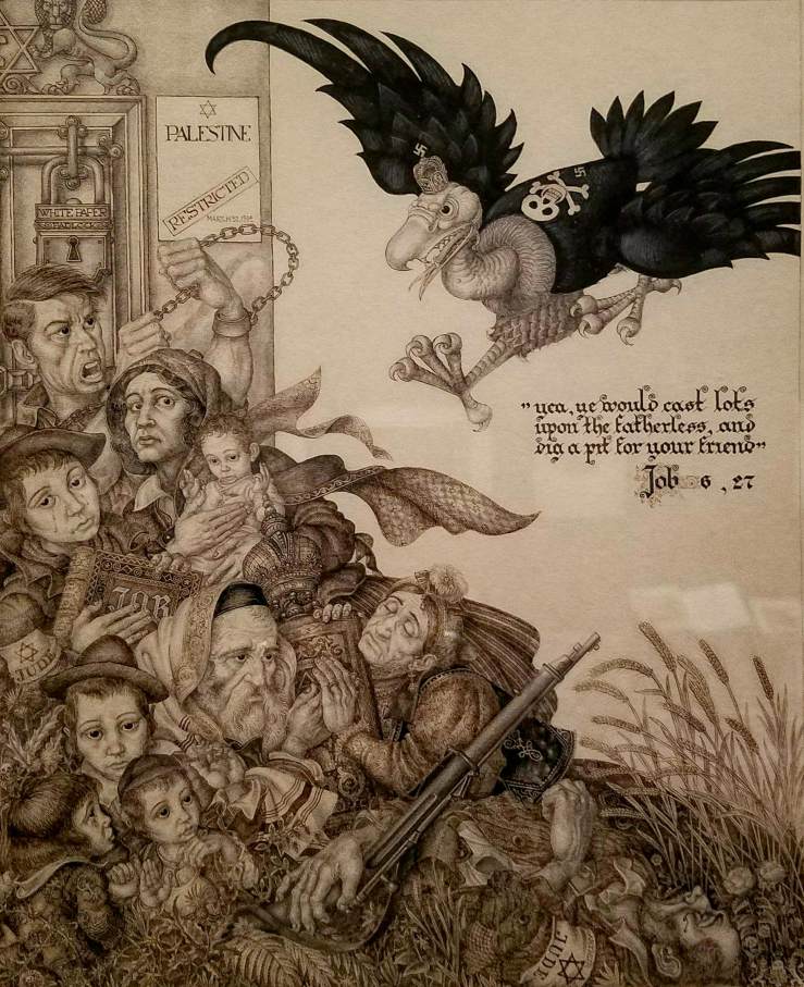 Palestine Restricted furthered Szyk’s condemnation of the White Paper by likening it to a fierce vulture descending on masses of dead and dying men, women and children. The notation, March 31, 1944, marks the date when the British further tightened Jewish immigration, requiring the consent of Palestinian Arabs.