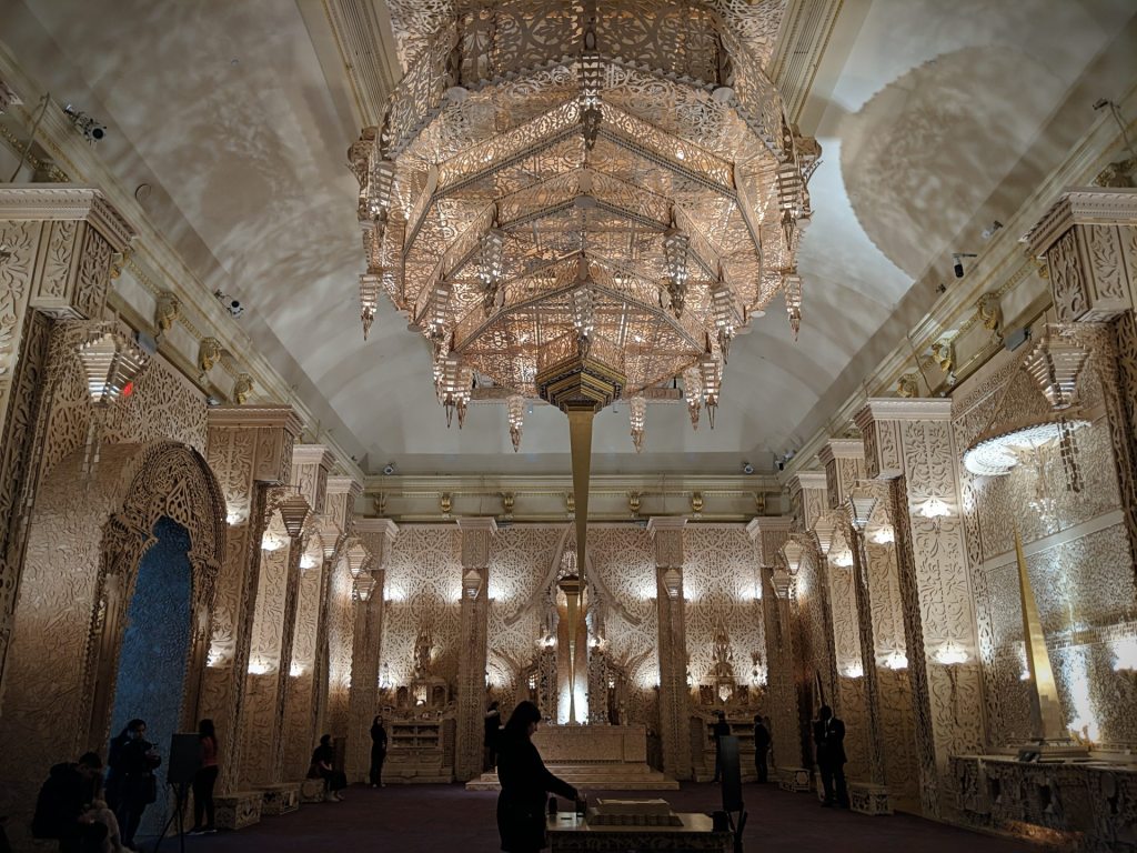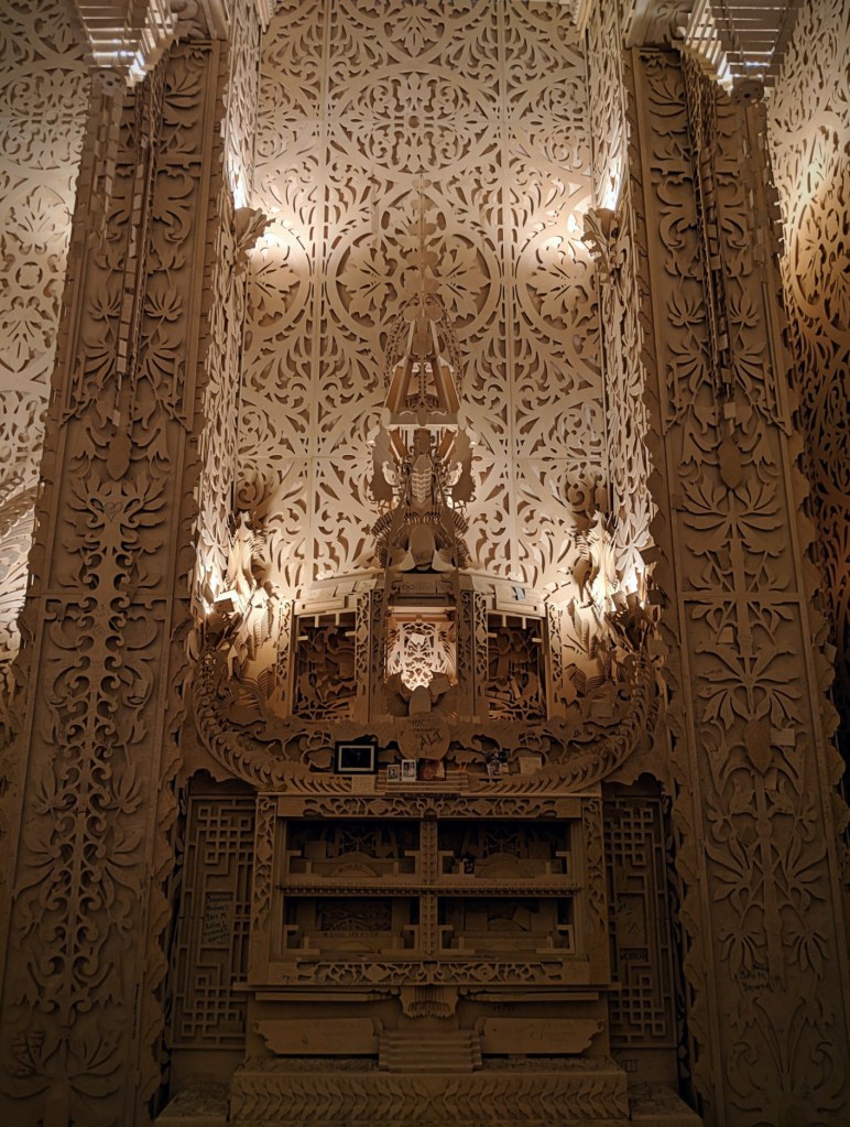 Originally part of the exhibition No Spectators: The Art of Burning Man, this site-specific installation covered the walls with intricately carved raw wood panels that lead to an ornate altar. Wooden placards were provided for visitors to write a personal message and leave within the installation [on show from March 2018 to January 2020].