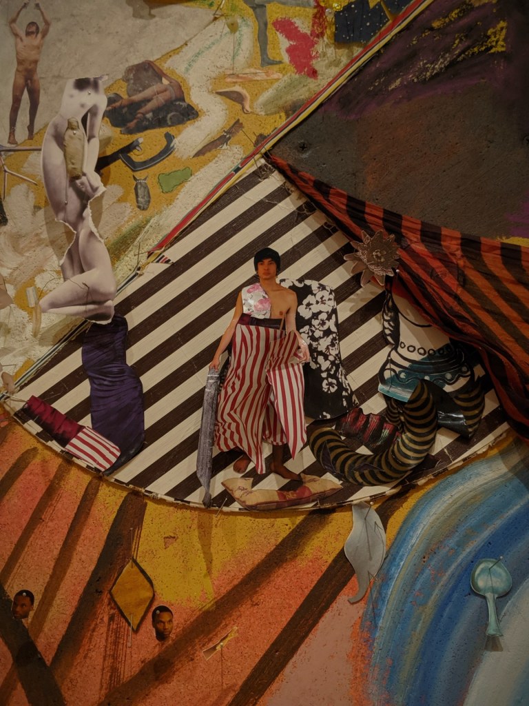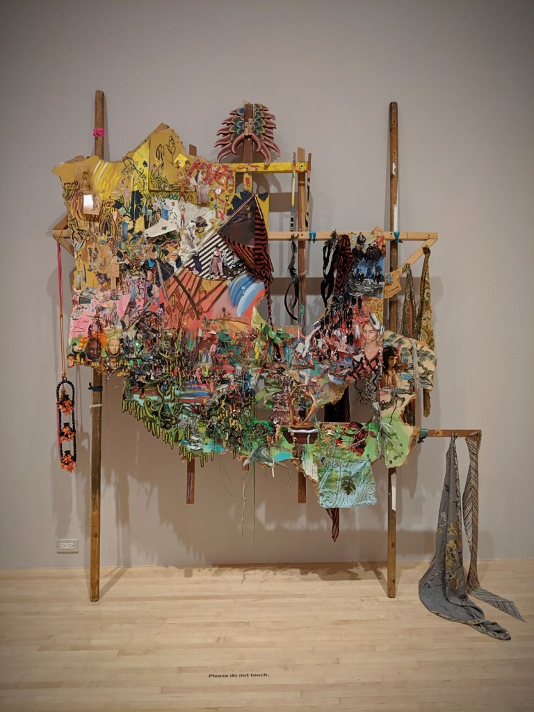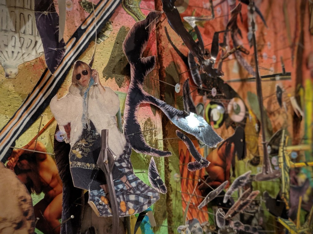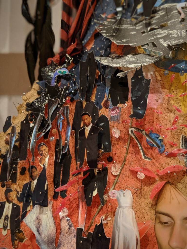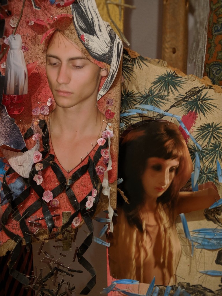 Paper, photographs, pins, plastic, corkboard, wood, string, found objects, feathers, silk, charcoal, pastel, oil stick, cardboard, fabric, wire, ribbon
