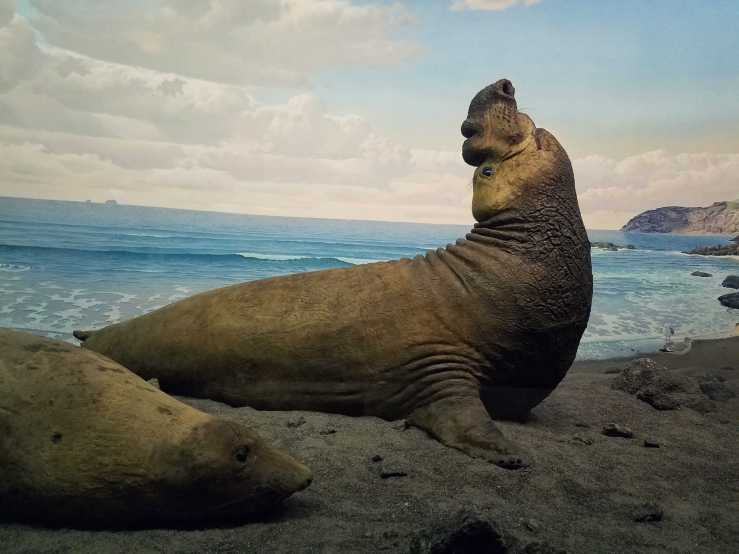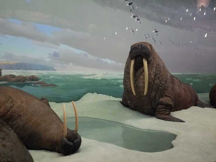Mammoths were widespread during the Ice Ages. Some had woolly fur to keep them warm. This is a ”non-woolly” mammoth that lived in southern parts of the United States, which were not covered by glaciers. Like living elephants, Mammoths had trunks. We can’t see it on this skeleton, because soft parts are rarely preserved as fossils. But we can see where the trunk was attached, at the large single opening high on the front of the skull. The Greek myth of one-eyed giants, the Cyclops, may have arisen when ancient people found fossil provoscidean skulls and mistook this nostril opening for an eye socket. Most mammoths died out by 11.000 years ago but a few somewhat dwarfed forms persisted until about 3.000 years ago on remote arctic islands.