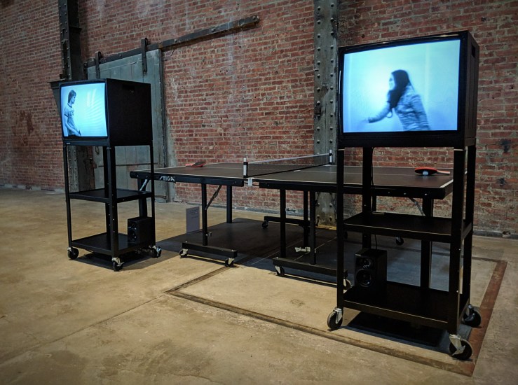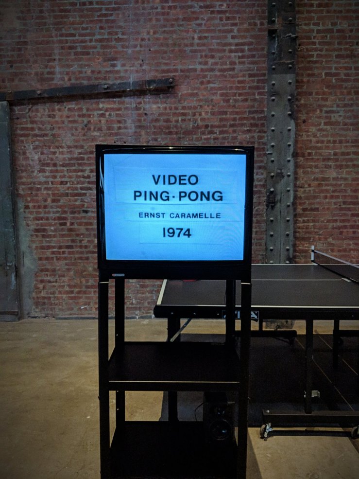 Ernst Caramelle’s ”Video-Ping-Pong” (1974) examines the relationship between the human body and video through a recording of a Ping-Pong match, which plays on two monitors mounted on AV carts at approximately eye level and positioned in front of a “real” Ping-Pong table. Sounds of the bouncing Ping-Pong ball are audible, although no ball is visible between the two monitors. The result is a disarming sense of the players’ presence in the space of the sculpture.