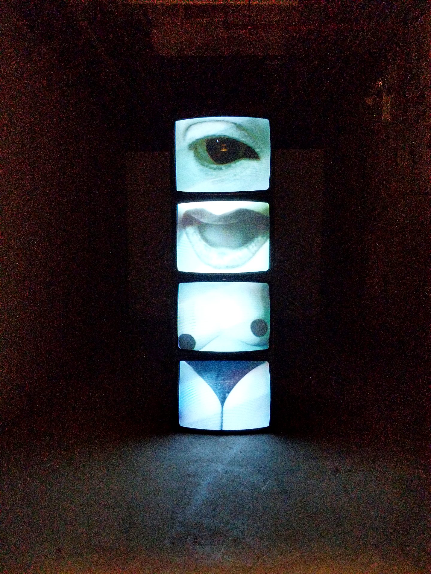 ”The New Embodied Sign Language” comprises four monitors displaying close-up videos of the artist’s body altered by theatrical makeup. The videos (subtitled Augenwerk [Eye Work], Mundwerk [Mouth Work], Bruststück [Breast Piece], and Schamwerk [Pubic Work]) are shown on monitors stacked on top of each other to reach roughly the height of a human body.