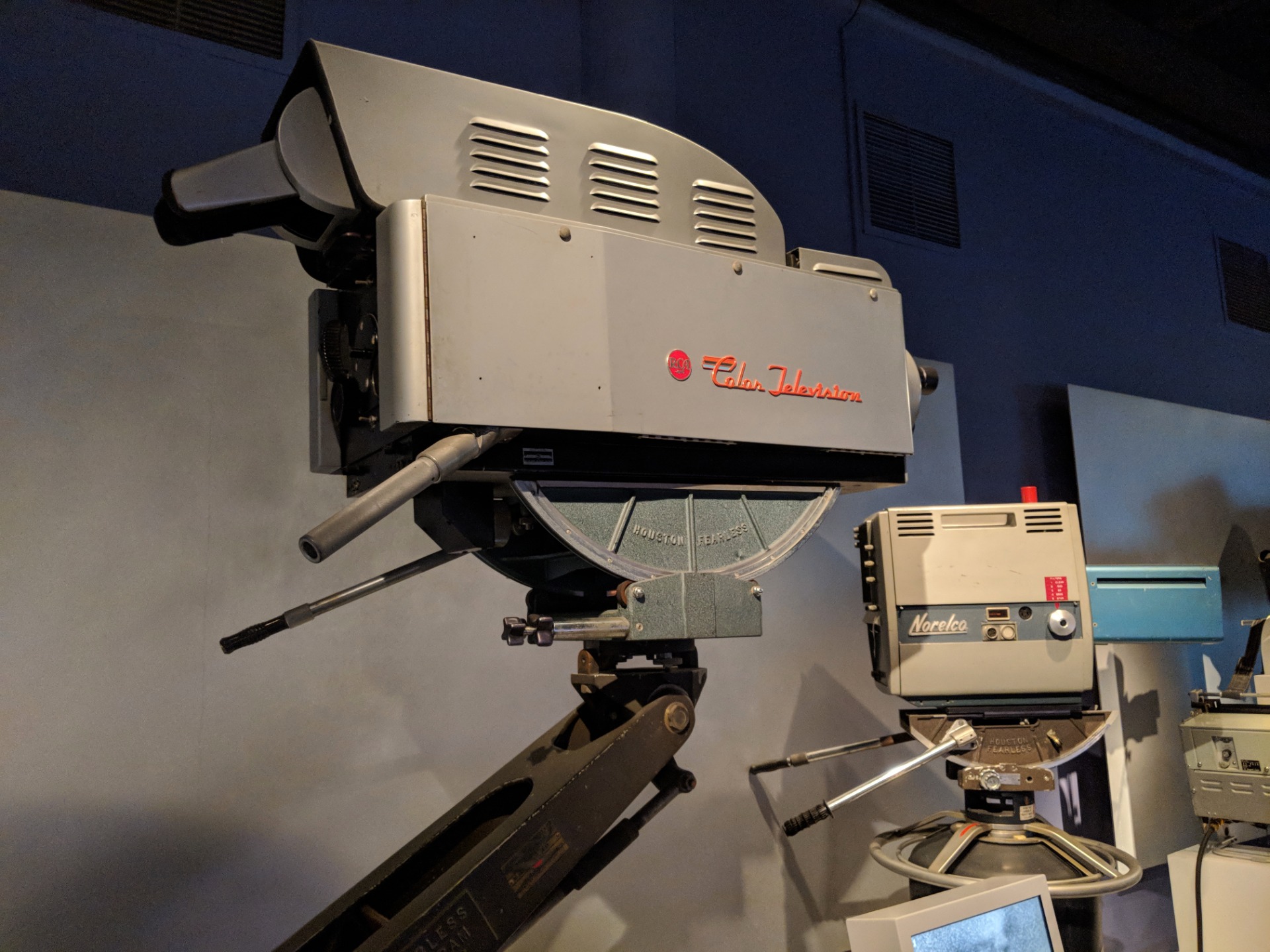 This camera was the first commercially produced for colour television; it was the industry standard for fifteen years. A beam-splitting prism directed the red, green and blue elements of the picture to their own three-inch-diametre image orthicon camera tubes. At 310 pounds, the weight of the camera head and viewfinder severely limited the camera’s mobility.