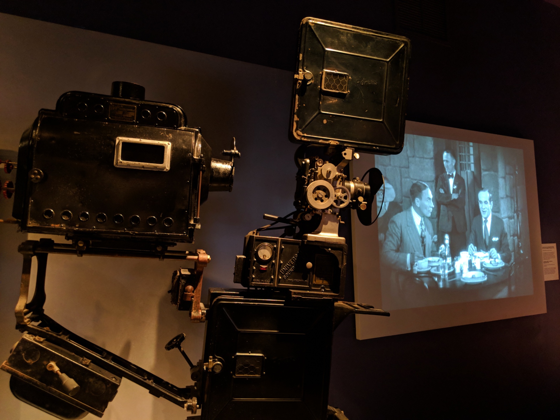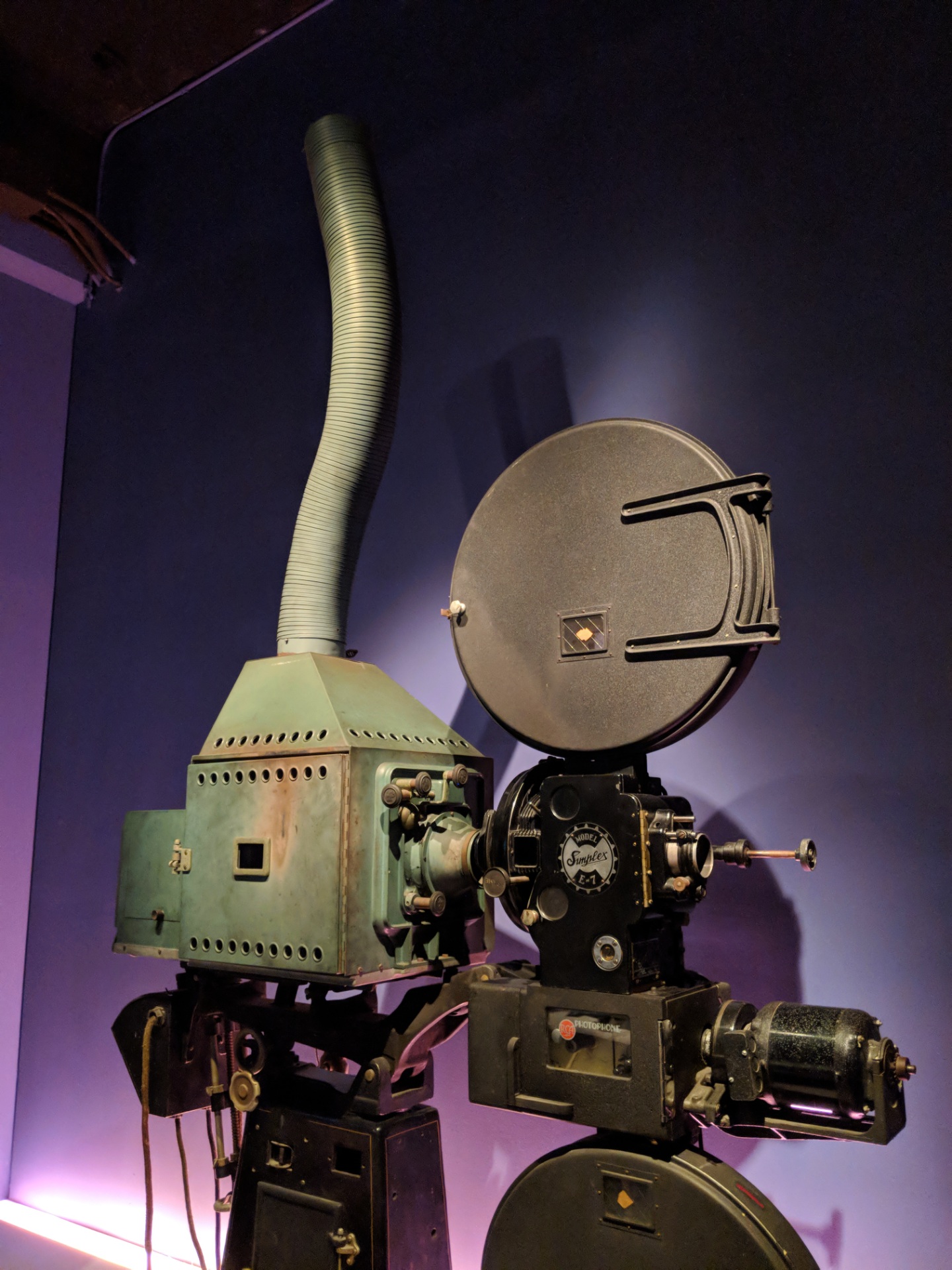 The projector exhibited here was originally used at the Aldine Theatre in Philadelphia, and is one of the only surviving Vitaphone projectors that is still operational. It has both a phonograph player for soundtrack discs and an optical sound head built into the projector. The projector is set up as if it were going to screen a film using a soundtrack disc. The record player and projector as powered by the same motor, which makes it possible for the sound and image to play in synchronicity.