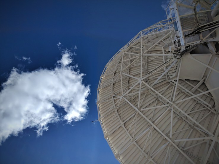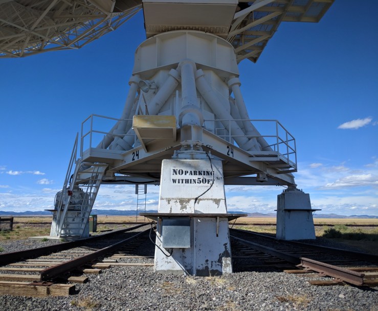 These giant antennas, with 25 metre (82 ft.) diametre dishes, were specially designed for the VLA. The aluminium panels of the dish are formed into a parabolic surface accurate to 0.5 millimetre (20 thousandths of an inch). Most of the time the antenna drive system is precisely tracking a radio source across the sky. Occasionally you will see the antenna rapidly slew from one radio source to another.