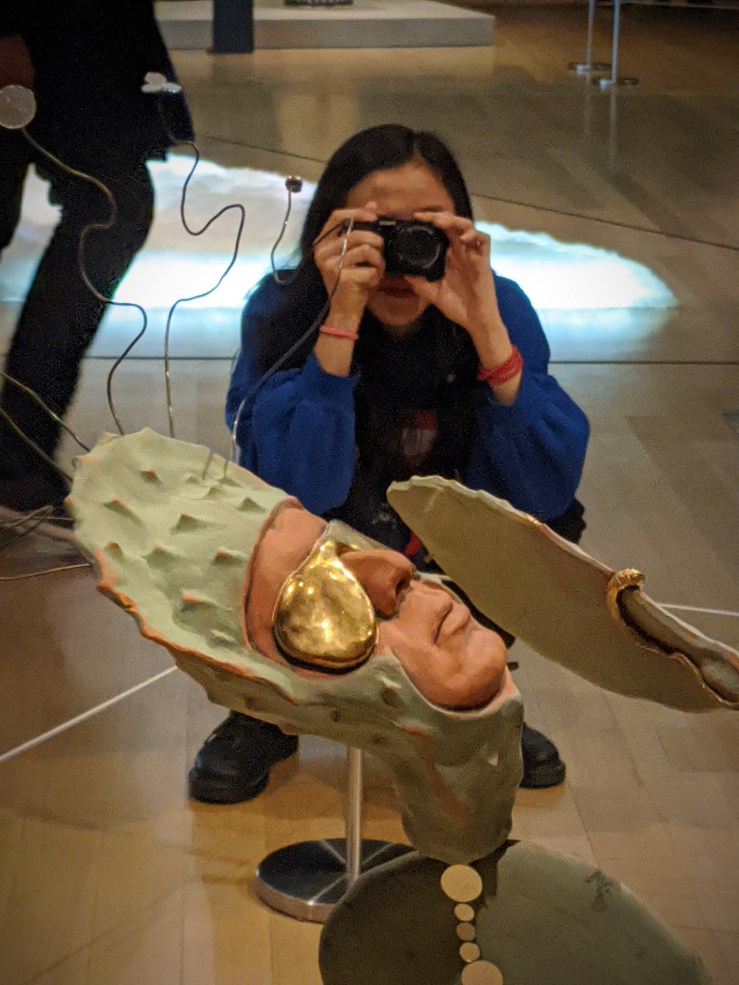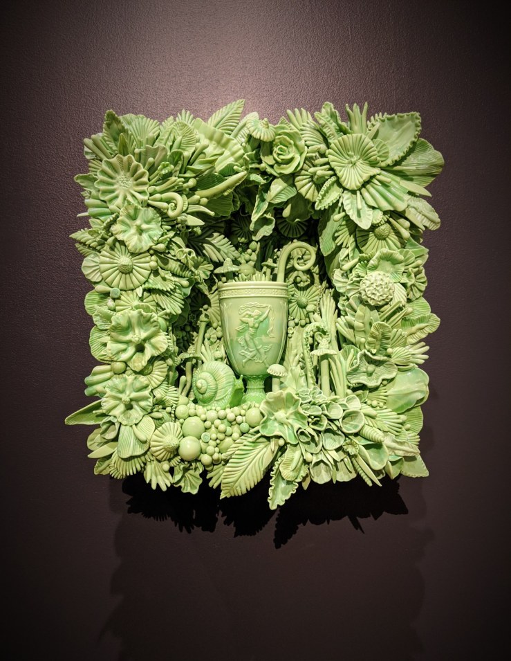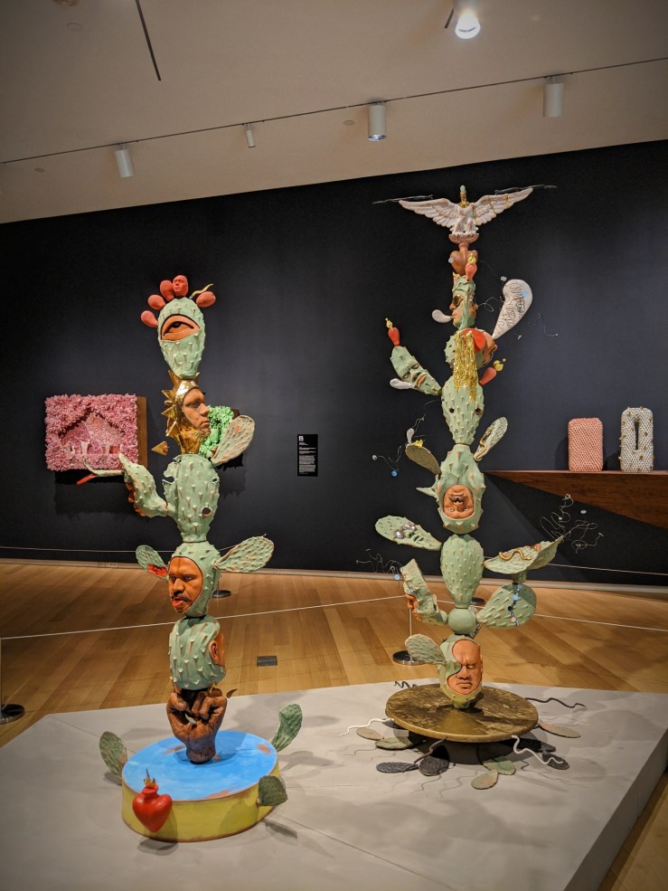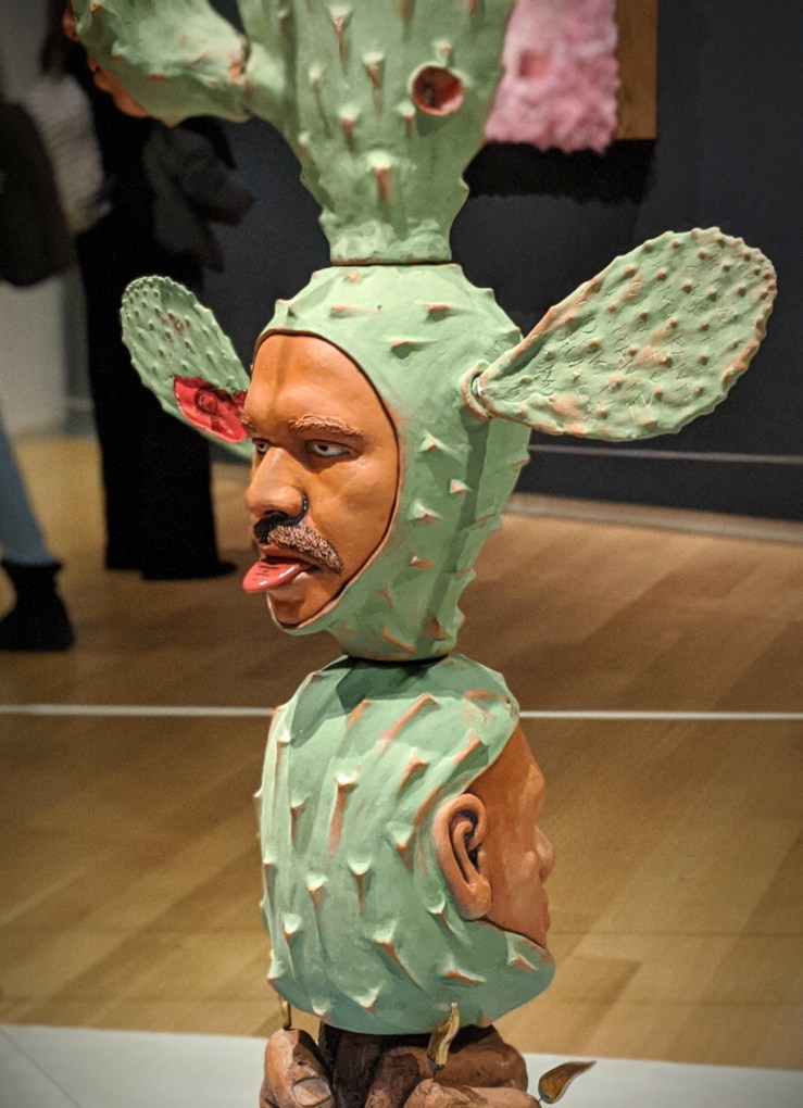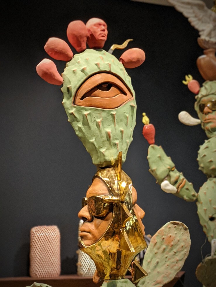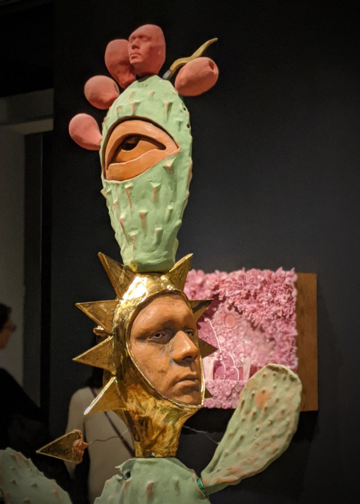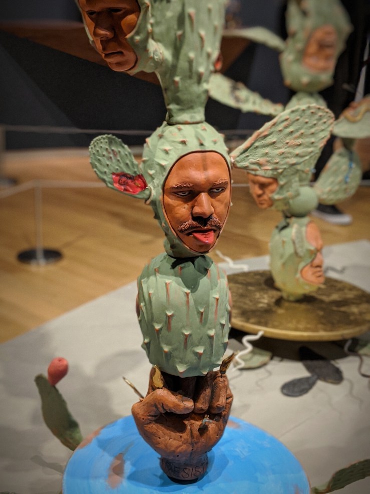 When Jiménez-Flores moved to the United States he spoke limited English. Art became his primary method of communication and means of commemorating his heritage. His practice prioritizes the depiction of Latinx people to ensure their representation in art for future generations. The “Nopales” series (nopales is Spanish for “prickly-pear cacti”) uses humor to challenge existing Latinx stereotypes in the United States. Likenesses of the artist, wearing shiny sunglasses and sticking out his tongue, are portrayed on cactus pads made of terra cotta and porcelain. This irreverent aesthetic references the work of Robert Arneson, father of funk ceramics, and also draws on the rich history of portraiture in Latin American visual culture, from Frida Kahlo’s paintings to Peruvian Moche vessels. The nopal, notable for its resilience in extreme conditions, is an important icon in Mexican culture—so much so that it is emblazoned on the country’s flag. For the artist, the cactus’s endurance symbolizes hope for the future.