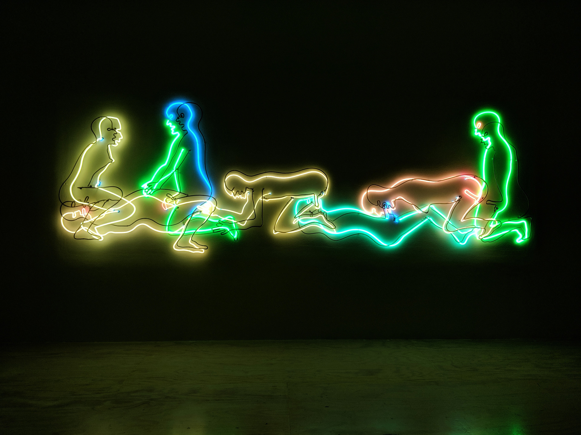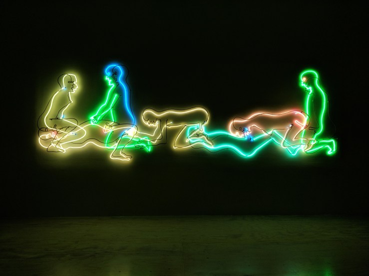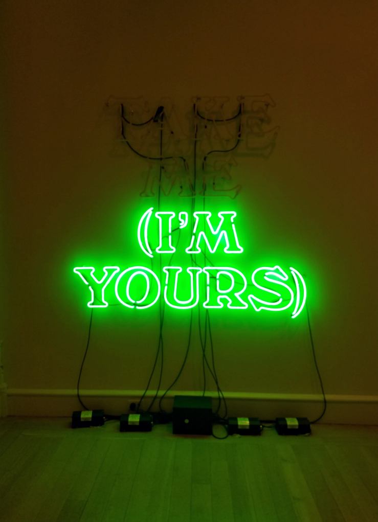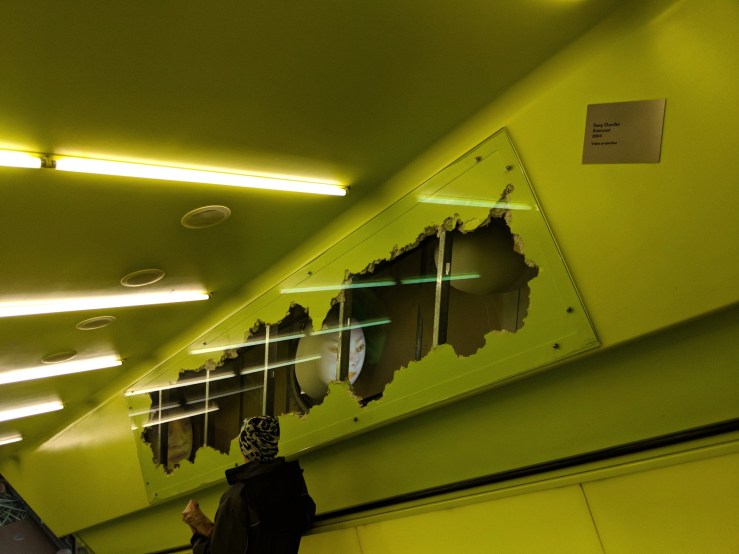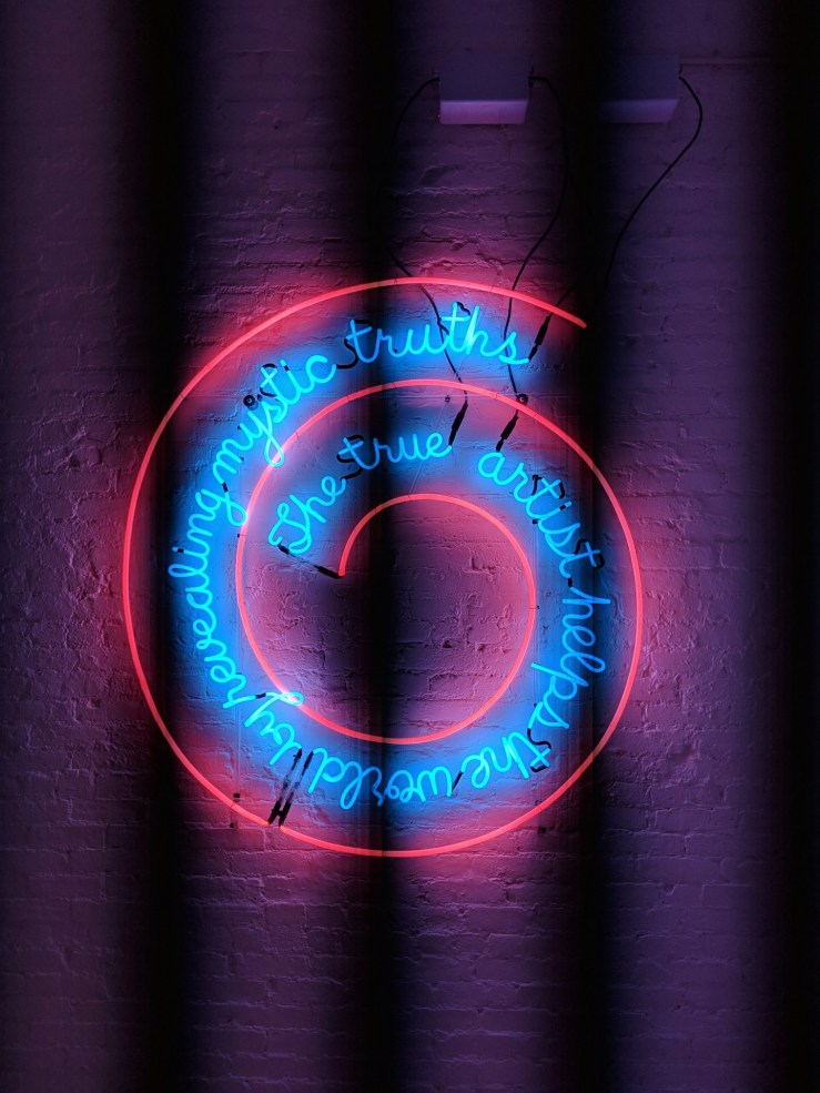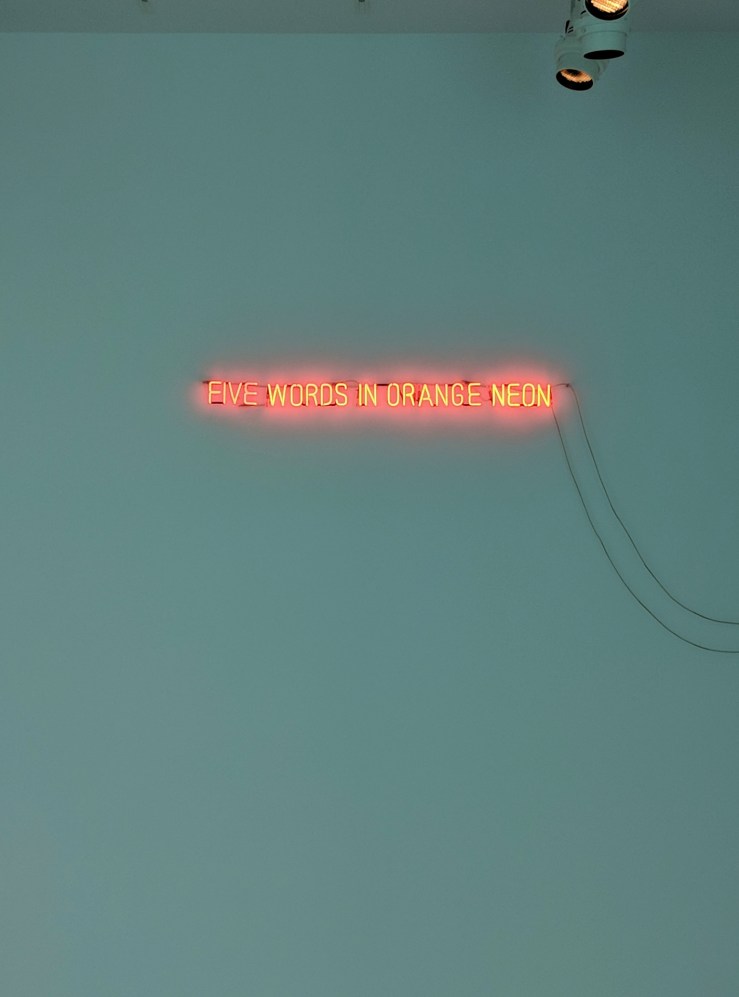 The reference to John Cage, in case you were wondering, is from an earlier work of Nauman’s, a telegram sent to the London gallerist Anthony d’Offay in response to a request for a work related to Cage. The telegram was misunderstood and was not exhibited; still intrigued by the expression ‘fat chance’, Nauman decided to reuse the words. [source: the Tate]