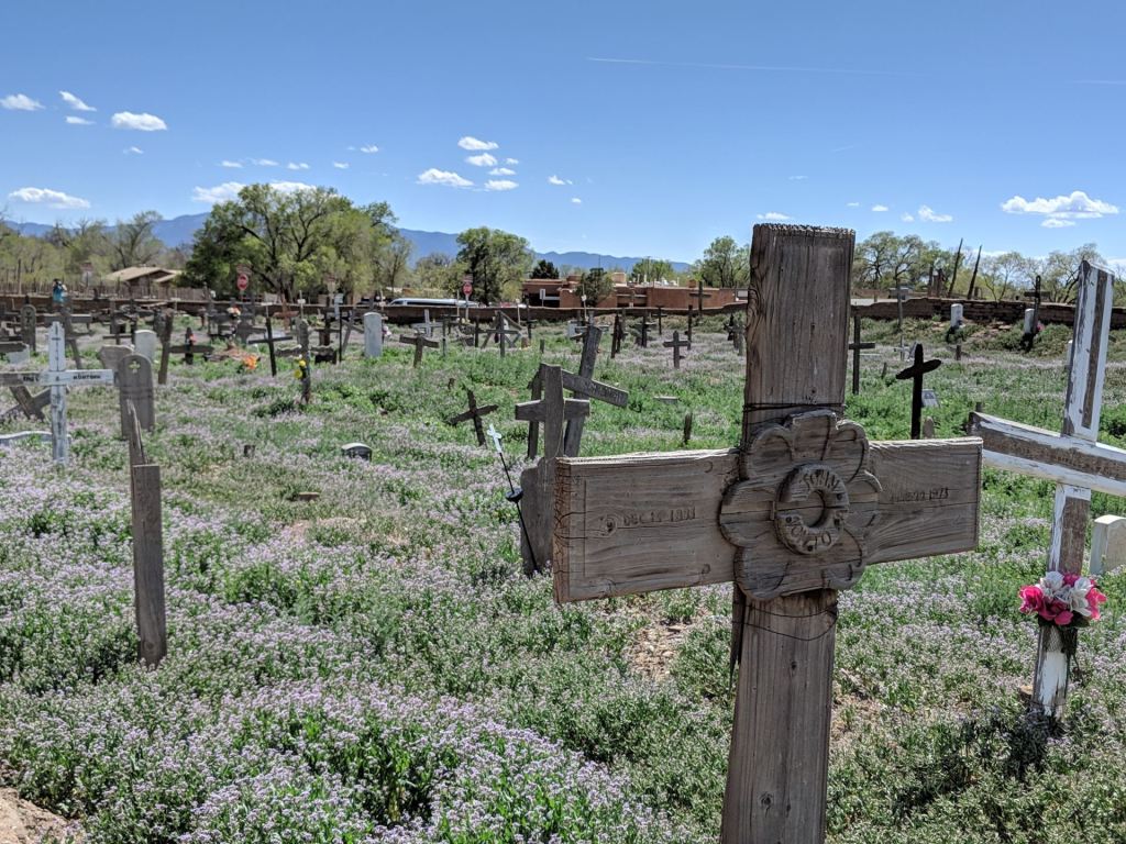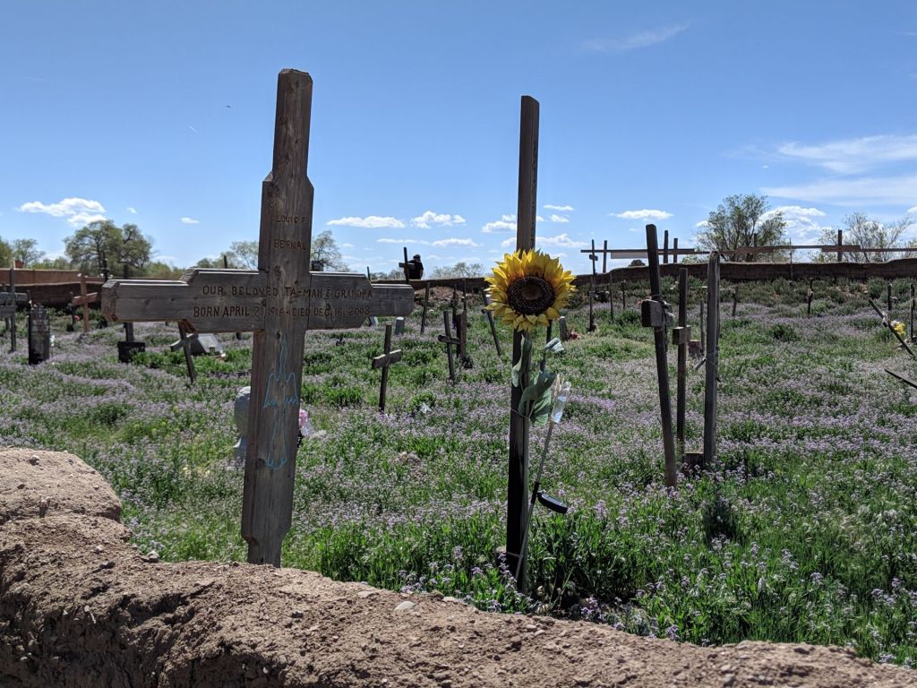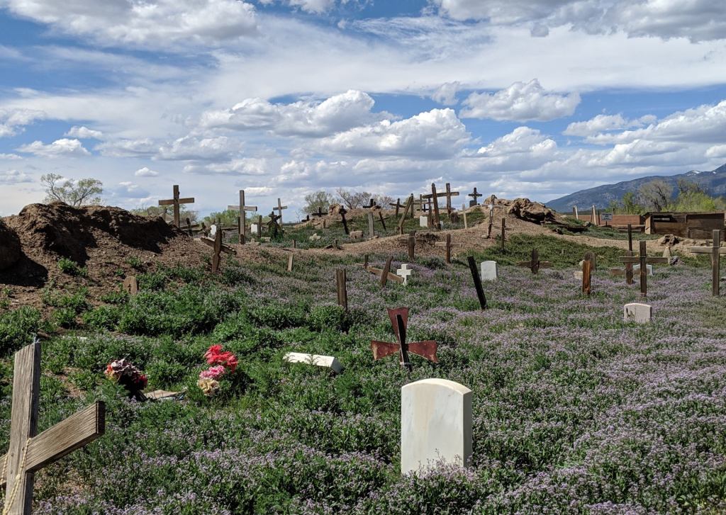 And certainly no outsiders’ presence is welcome in the native religious ceremonies and rituals that take place around the Blue Lake, or Ba Yhyea, an ancient sacred site for the Taos Pueblo community, hidden in the mountains we see rising beyond the village.
