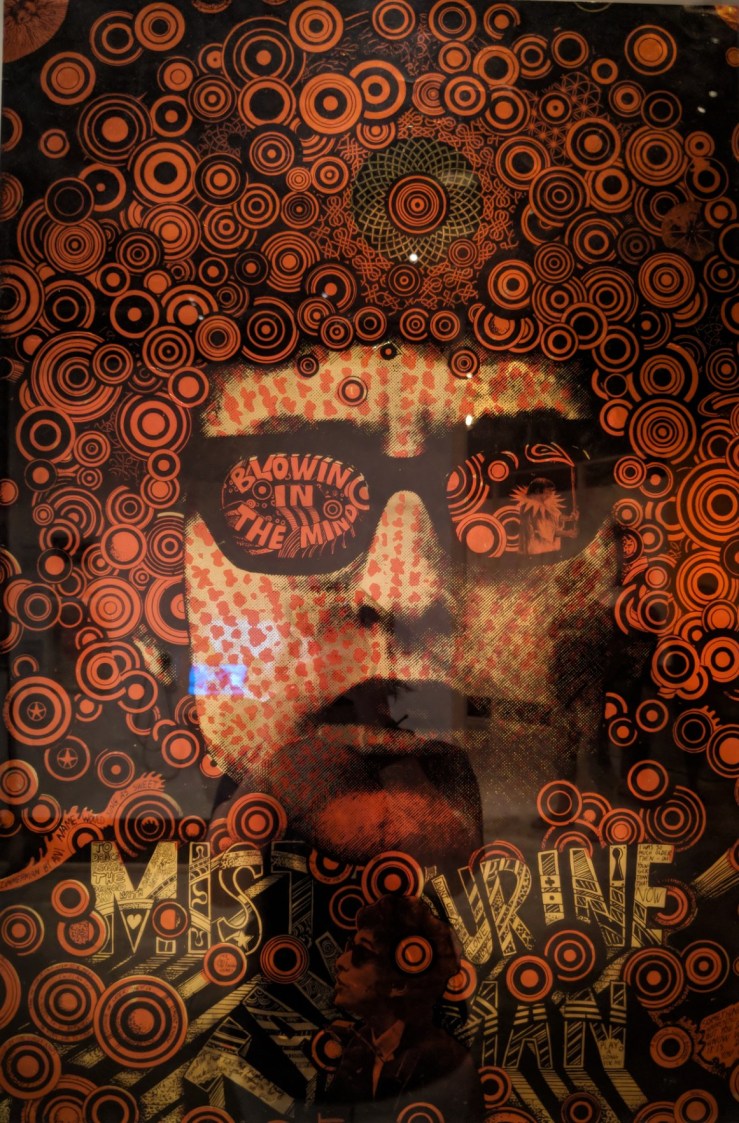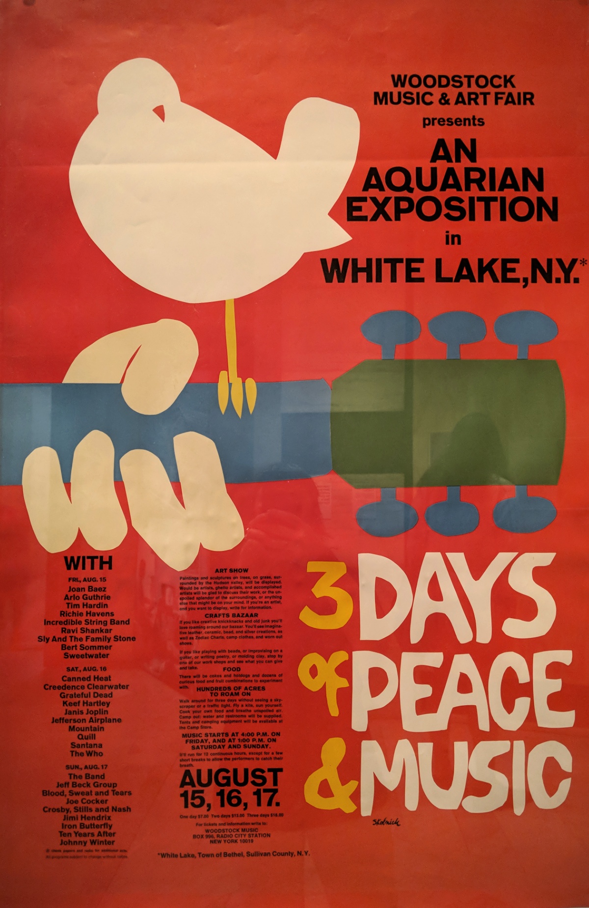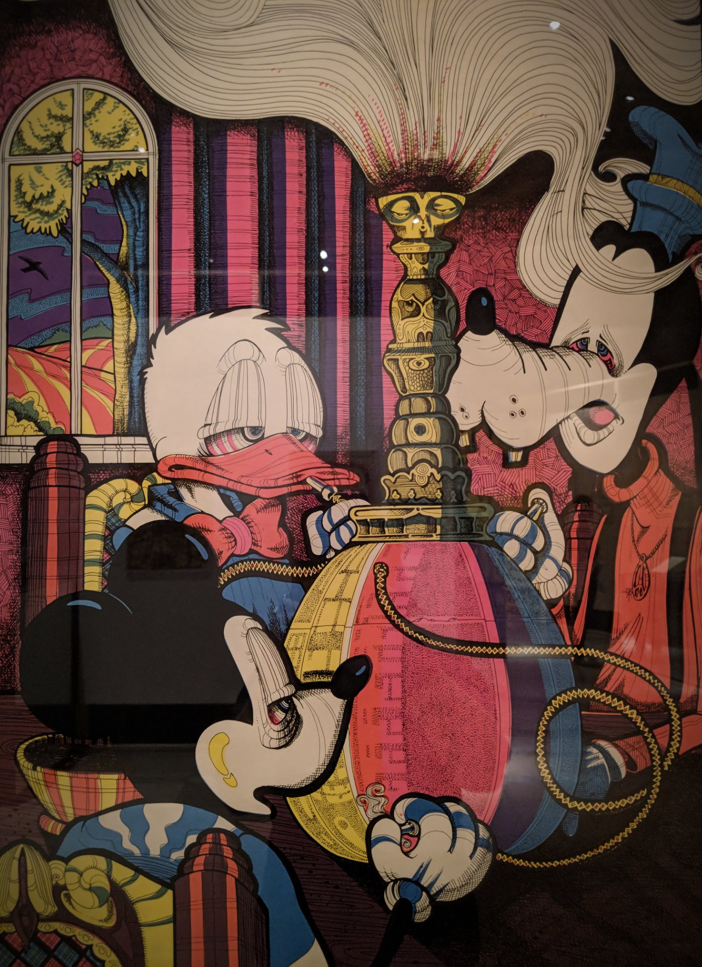 This poster, the title of which play on Bob Dylan’s anti-establishment song ”Ain’t Gonna Work on Maggie’s Farm No More”, depicts three of Disney’s most famous characters – Donald Duck, Mickey Mouse and Goofy – seated around a smoke-billowing hookah, filled, presumably, with hashish. Each smoker holds a mouthpiece, his eyelids drooping over bloodshot eyes and mouth agape. Disney Studios responded with a copyright-infringement lawsuit, resulting in the destruction of most of the print run. The poster is signed ”Petagno III”, the early signature of artist Joe Petagno, best known for his album covers for psychedelic and heavy-metal bands, including Pink Floyd, Led Zeppelin, Motörhead and Nazareth.