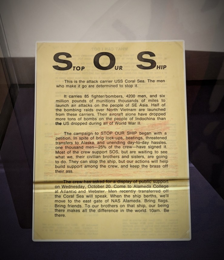 On November 6, 1971, more than 300 sailors from the aircraft carrier Coral Sea marched in an antiwar demonstration in San Francisco. Six days later, from 600 to 1200 protesters demonstrated outside the naval air station in Alameda, California, encouraging servicemen to desert the ship before its departure for duty in the Vietnam War. The Berkeley City Council and 10 area churches offered sanctuary to any who did. Thirty-five sailors failed to report for duty prior to the sailing. This broadside calls for a show of unity with those servicemen, ”who have asked for a display of public support. Bring Flags. Bring friends.”