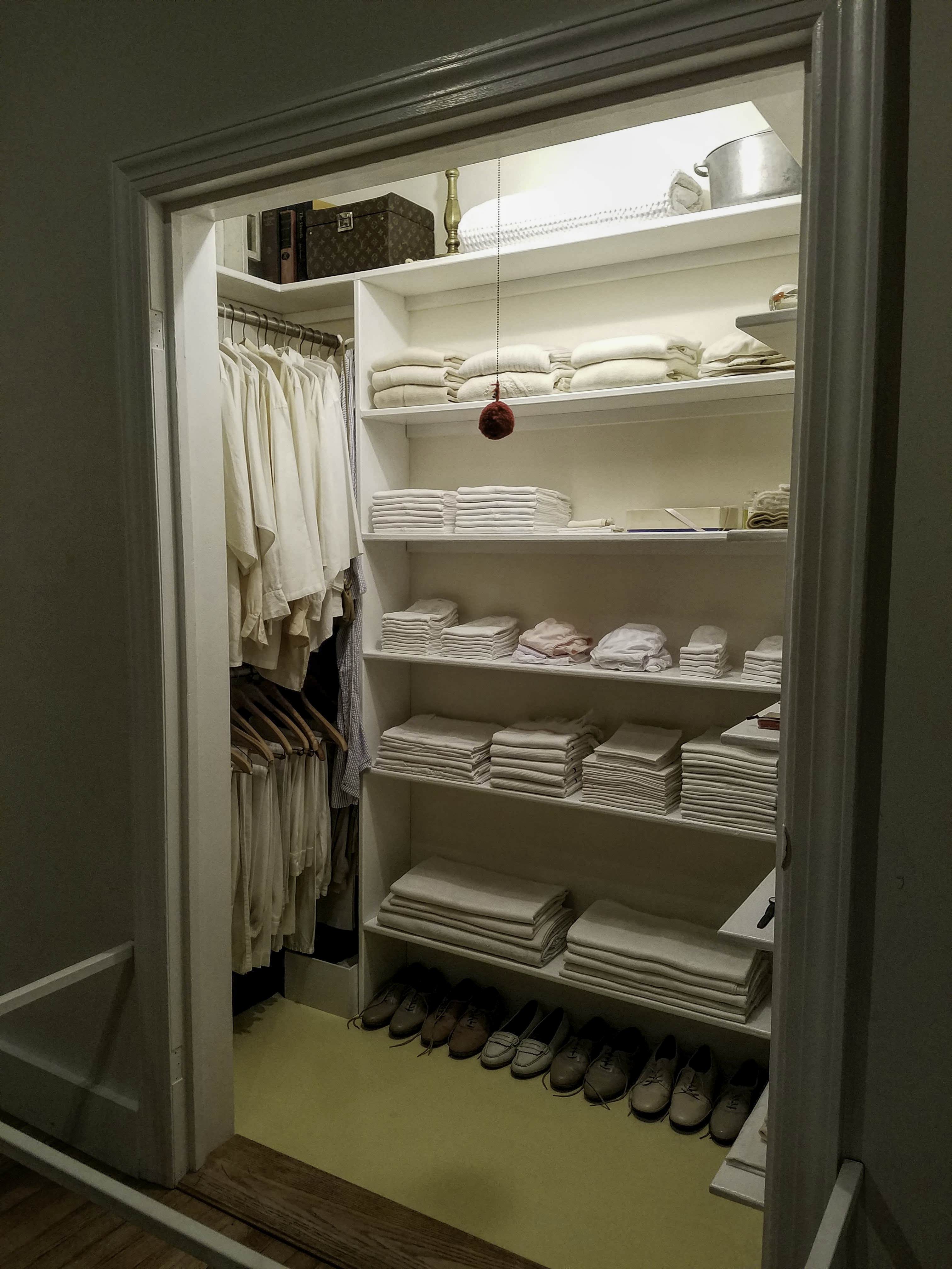 This exhibition represents Berman’s life from 1982 to 2004, when she lived by herself in a small apartment in Greenwich Village. In her closet Berman lovingly organized her shoes, clothes, linens, beauty products, luggage, and other necessities. Although the clothing is of various tints—including cream, ivory, and ecru—it gives the impression of being all white.}