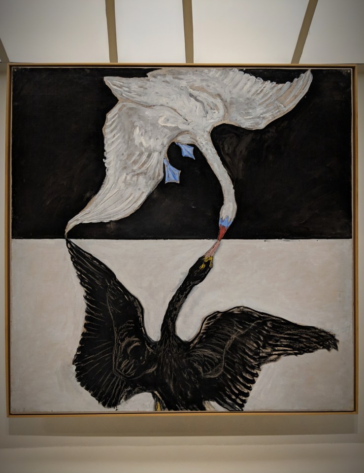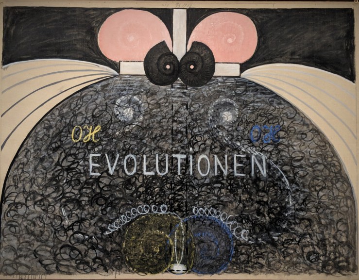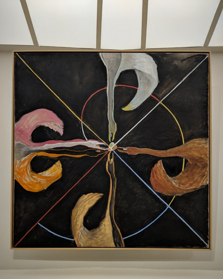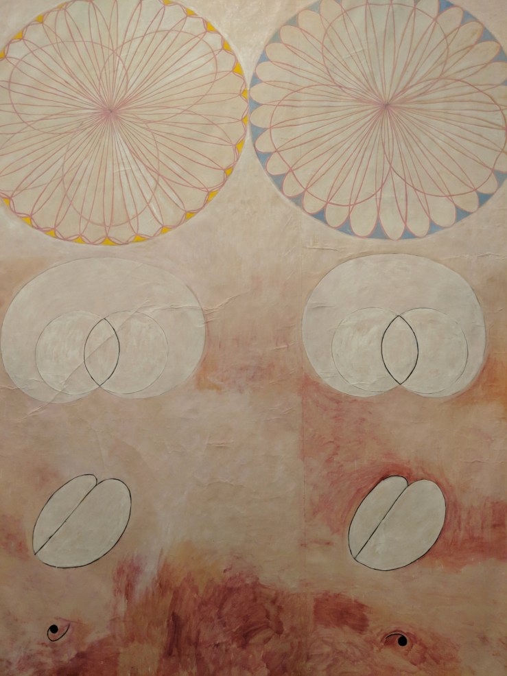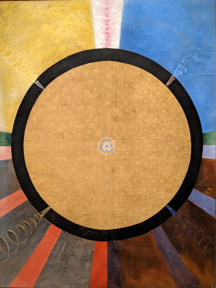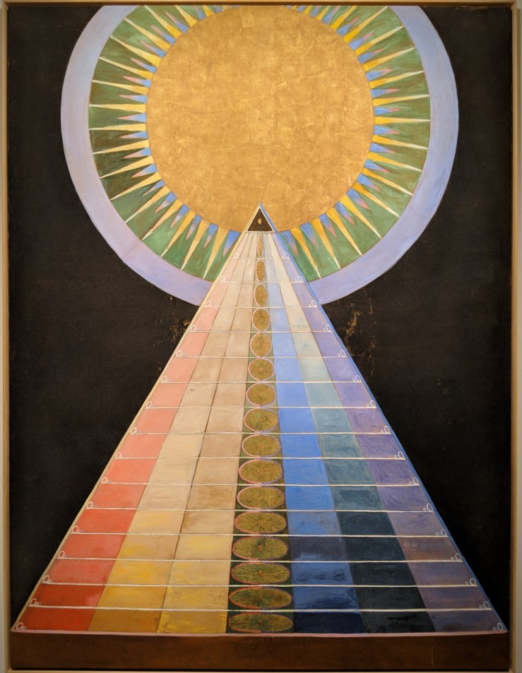 When Hilma af Klint began creating radically abstract paintings in 1906, they were like little that had been seen before: bold, colorful, and untethered from any recognizable references to the physical world. It was years before Vasily Kandinsky, Kazimir Malevich, Piet Mondrian, and others would take similar strides to rid their own artwork of representational content. Yet while many of her better-known contemporaries published manifestos and exhibited widely, af Klint kept her groundbreaking paintings largely private. She rarely exhibited them and, convinced the world was not yet ready to understand her work, stipulated that it not be shown for twenty years following her death. Ultimately, her work was all but unseen until 1986, and only over the subsequent three decades have her paintings and works on paper begun to receive serious attention. [source: The Guggenheim]