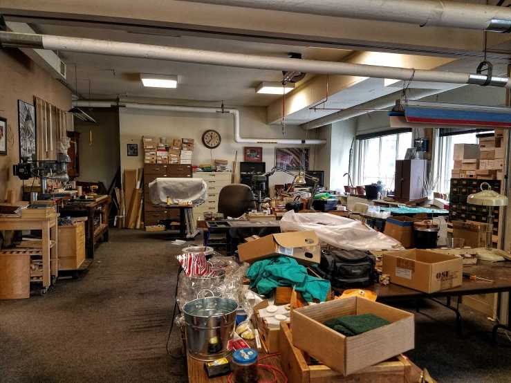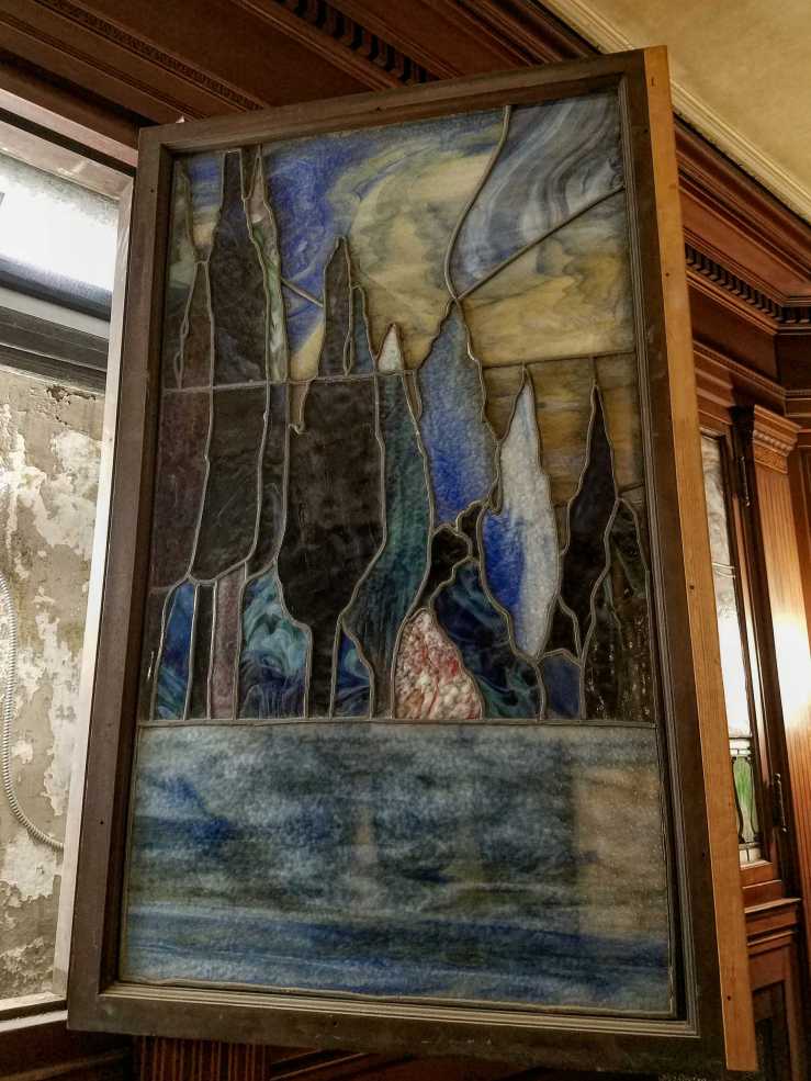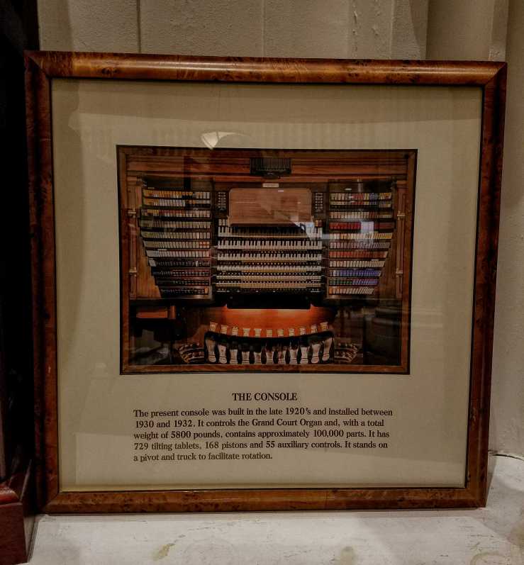The tour includes unused spaces restricted from public view, such as this room adorned with wood and these magnificent Tiffany stained glass panels; it takes a look at the Egyptian Hall and Greek Hall auditoria, hidden behind the shop’s executive offices; walks through the organ workshop where repairs and restoration take place to this day; and, finally, to the grand Crystal Tea Room where – as expected – preparations for a wedding reception were underway.