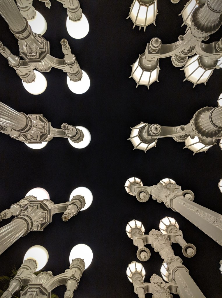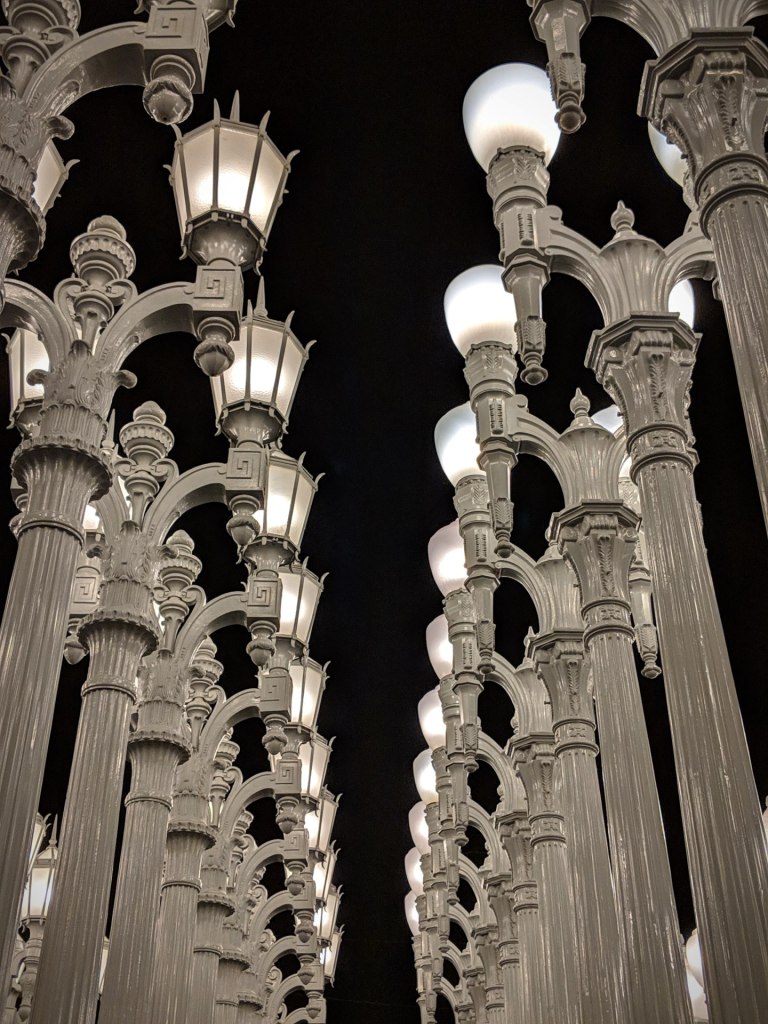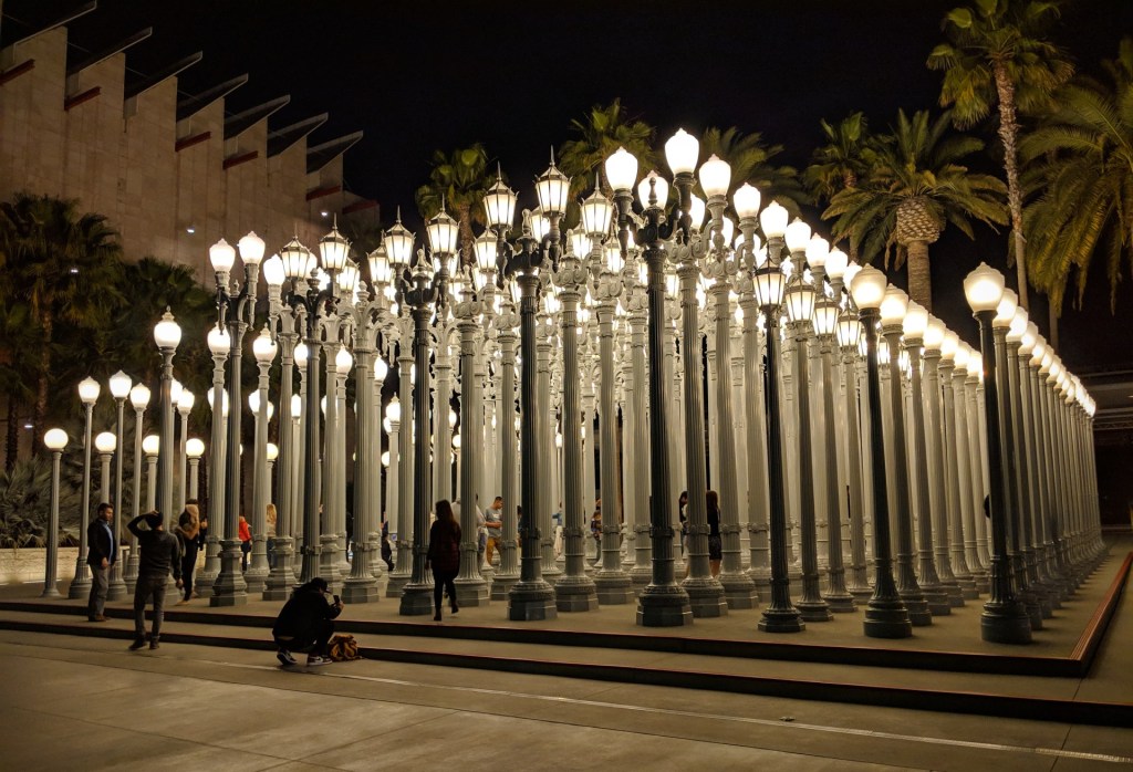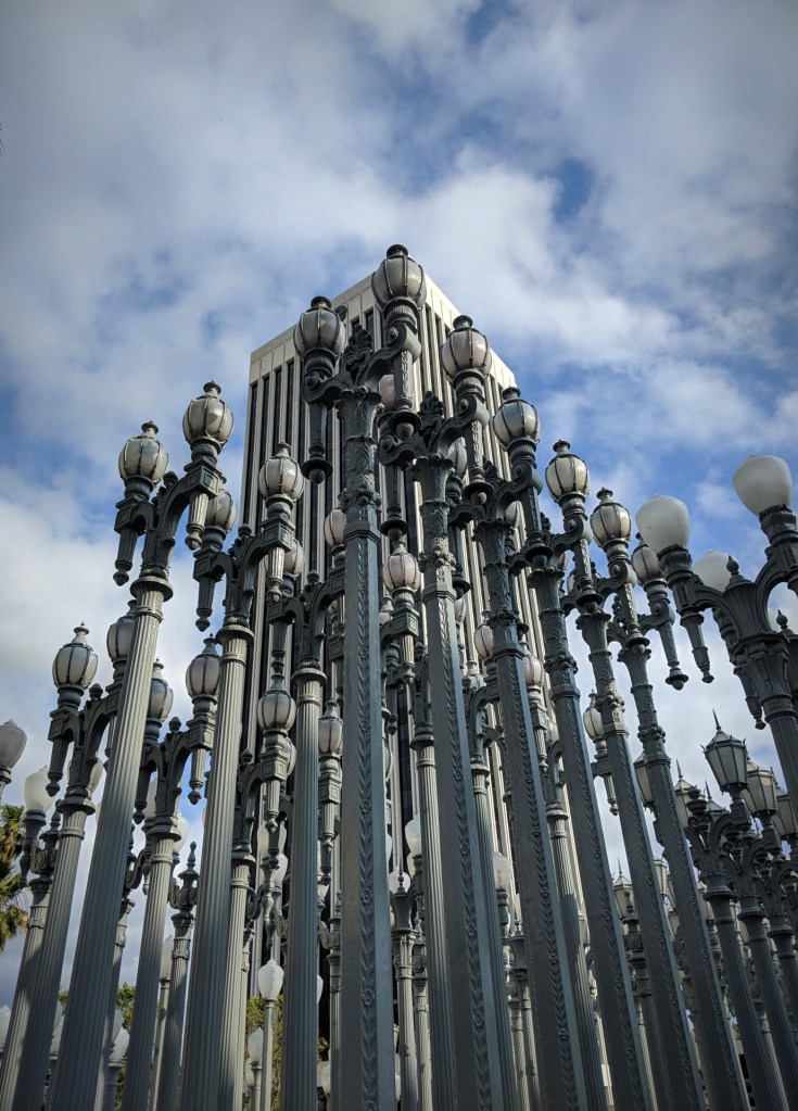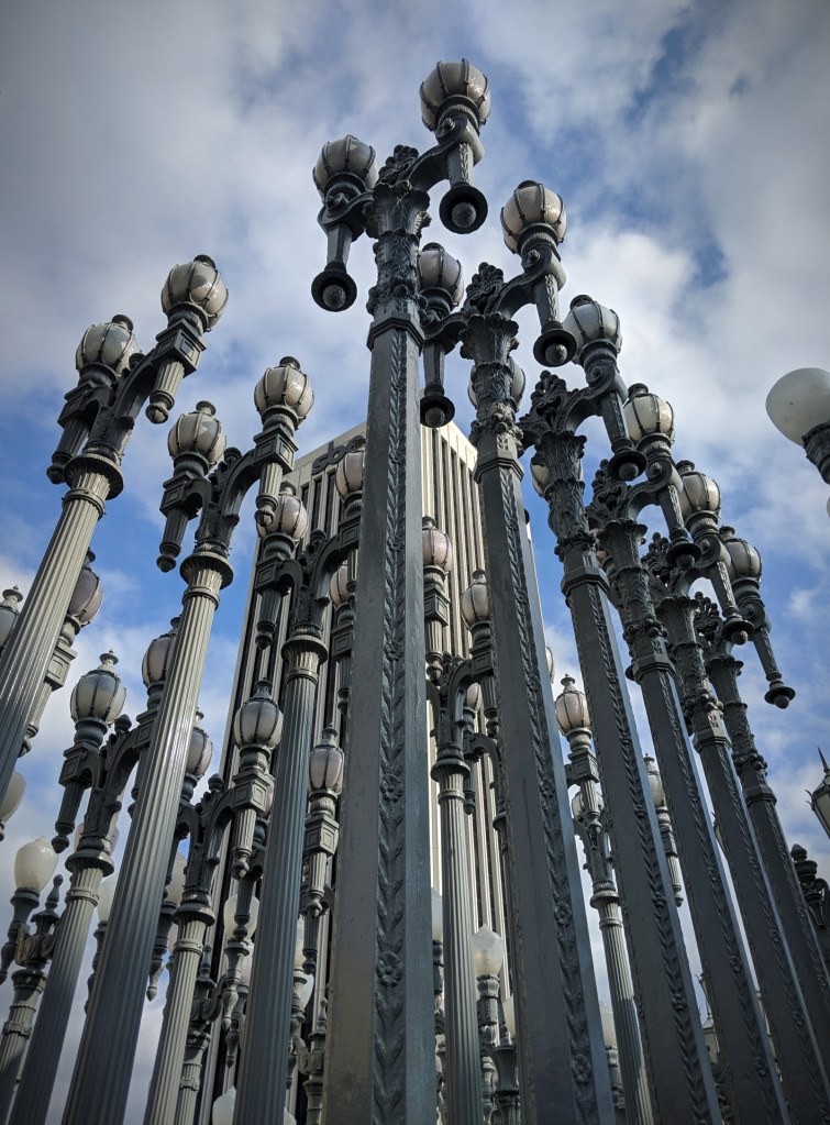 An assemblage sculpture of 202 vintage street light lampposts from the 1920s and 1930s, created by Chris Burden with the express intention to be placed in the empty plaza in front of the Los Angeles County Museum of Art, on Wilshire Boulevard. The cast iron lampposts range from 20 to 30 feet in height and were salvaged from Los Angeles neighborhoods. The installation is lit up from dusk to dawn and is solar-powered. Especially popular after dark, be prepared to drive a few rounds before finding a parking spot close enough.