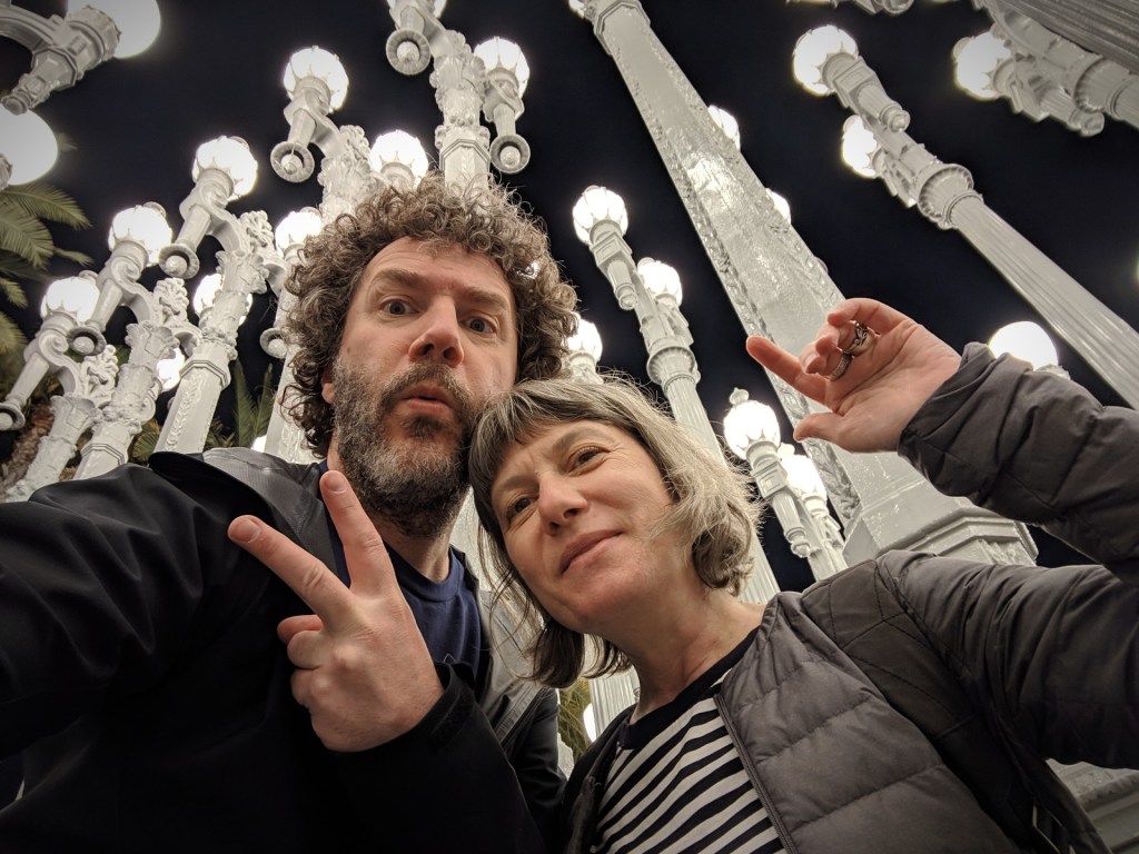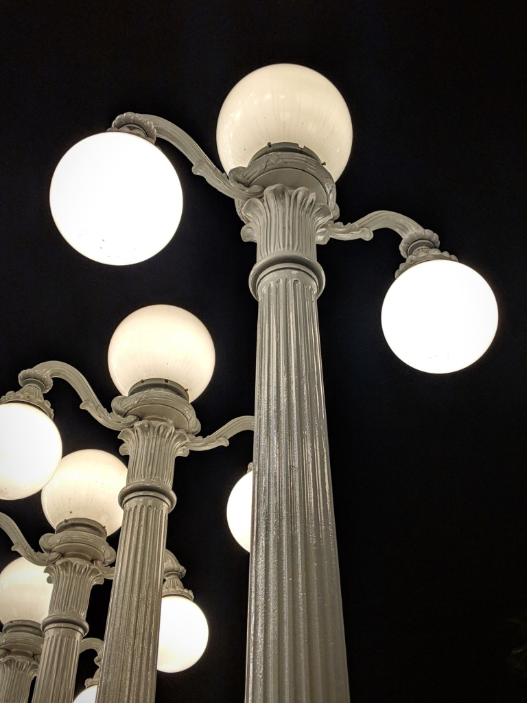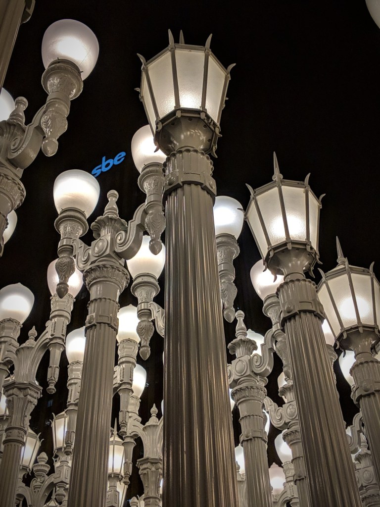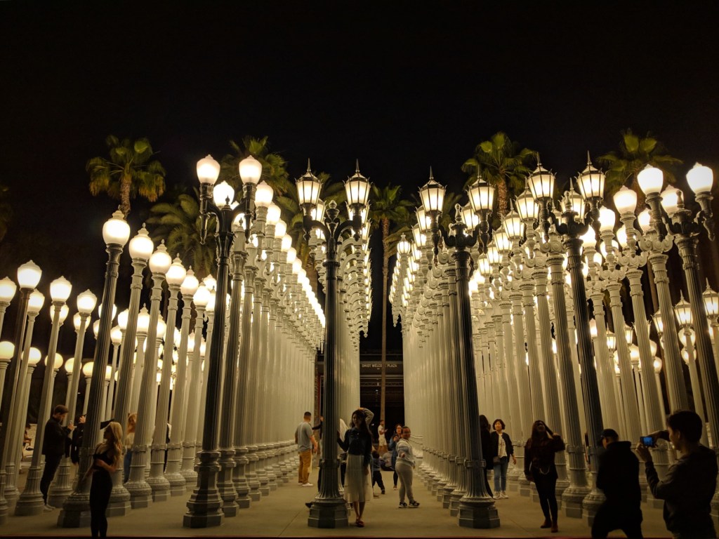 An assemblage sculpture of 202 vintage street light lampposts from the 1920s and 1930s, created by Chris Burden with the express intention to be placed in the empty plaza in front of the Los Angeles County Museum of Art, on Wilshire Boulevard. The cast iron lampposts range from 20 to 30 feet in height and were salvaged from Los Angeles neighborhoods. The installation is lit up from dusk to dawn and is solar-powered. Especially popular after dark, be prepared to drive a few rounds before finding a parking spot close enough.