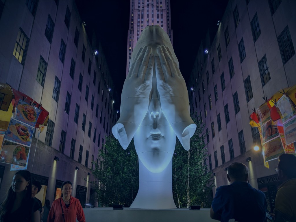 Jaume Plensa’s monumental portrait Behind the Walls & Nick Cave’s oversized bronze gramophone growing from his raised fist, suggesting the power to activate change.