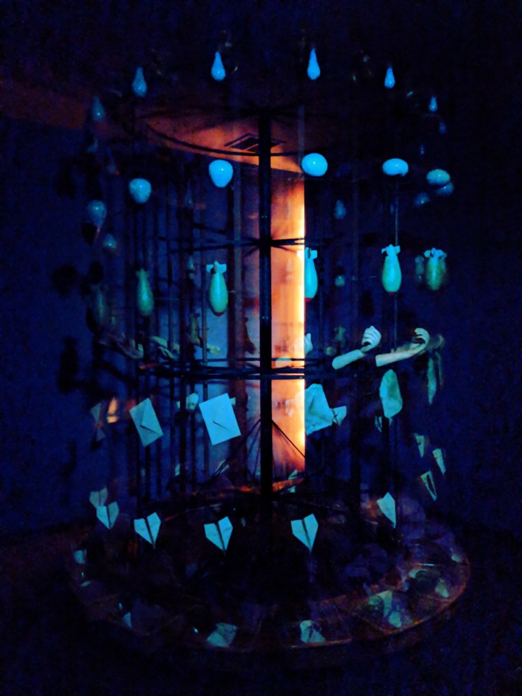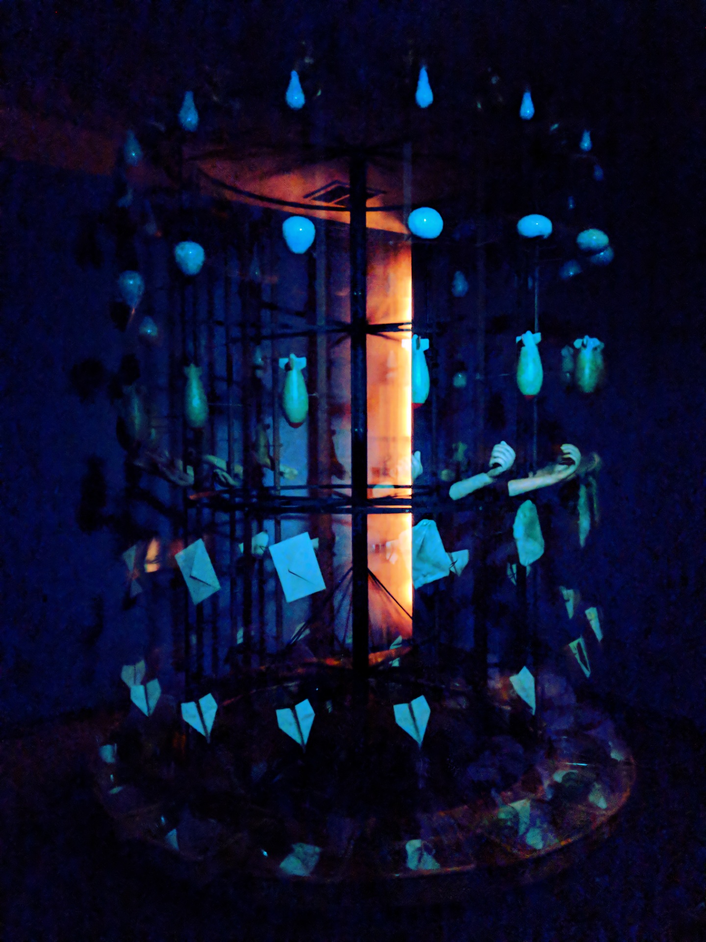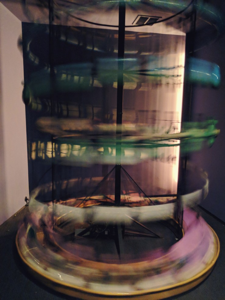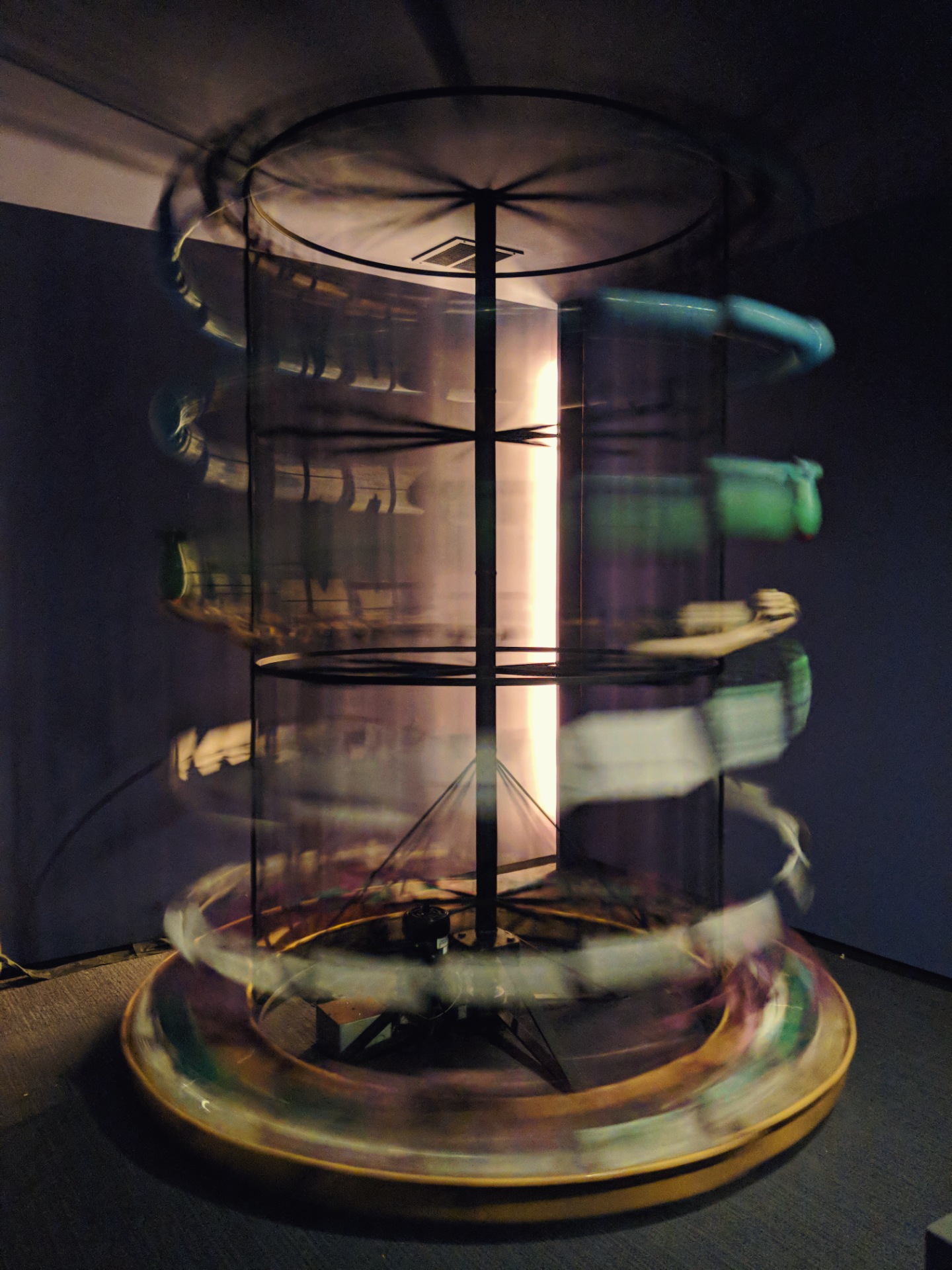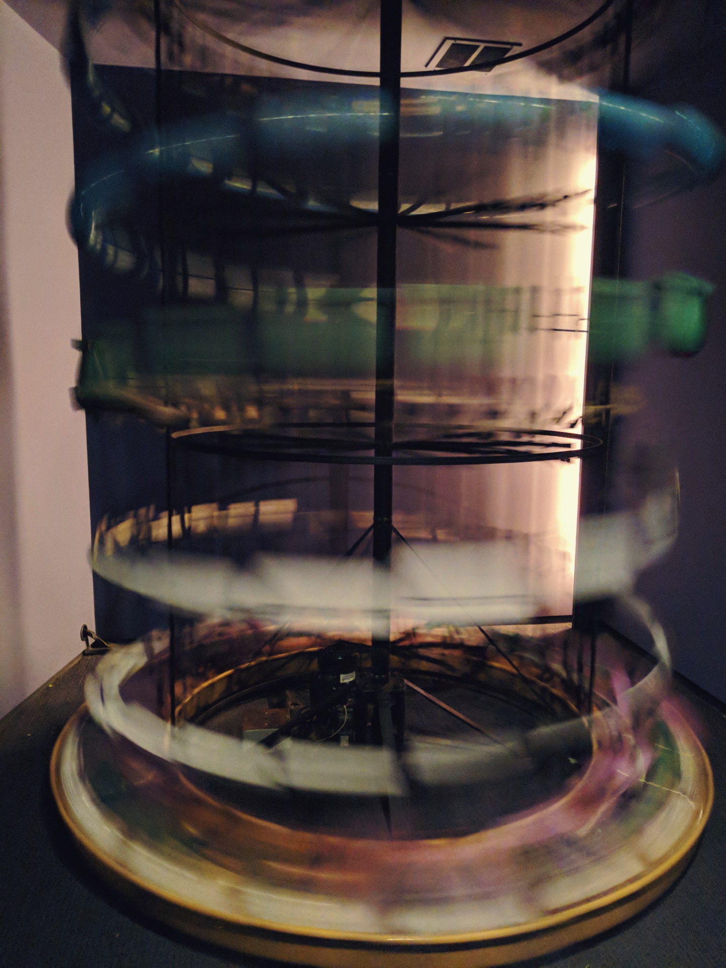 The projector exhibited here was originally used at the Aldine Theatre in Philadelphia, and is one of the only surviving Vitaphone projectors that is still operational. It has both a phonograph player for soundtrack discs and an optical sound head built into the projector. The projector is set up as if it were going to screen a film using a soundtrack disc. The record player and projector as powered by the same motor, which makes it possible for the sound and image to play in synchronicity.