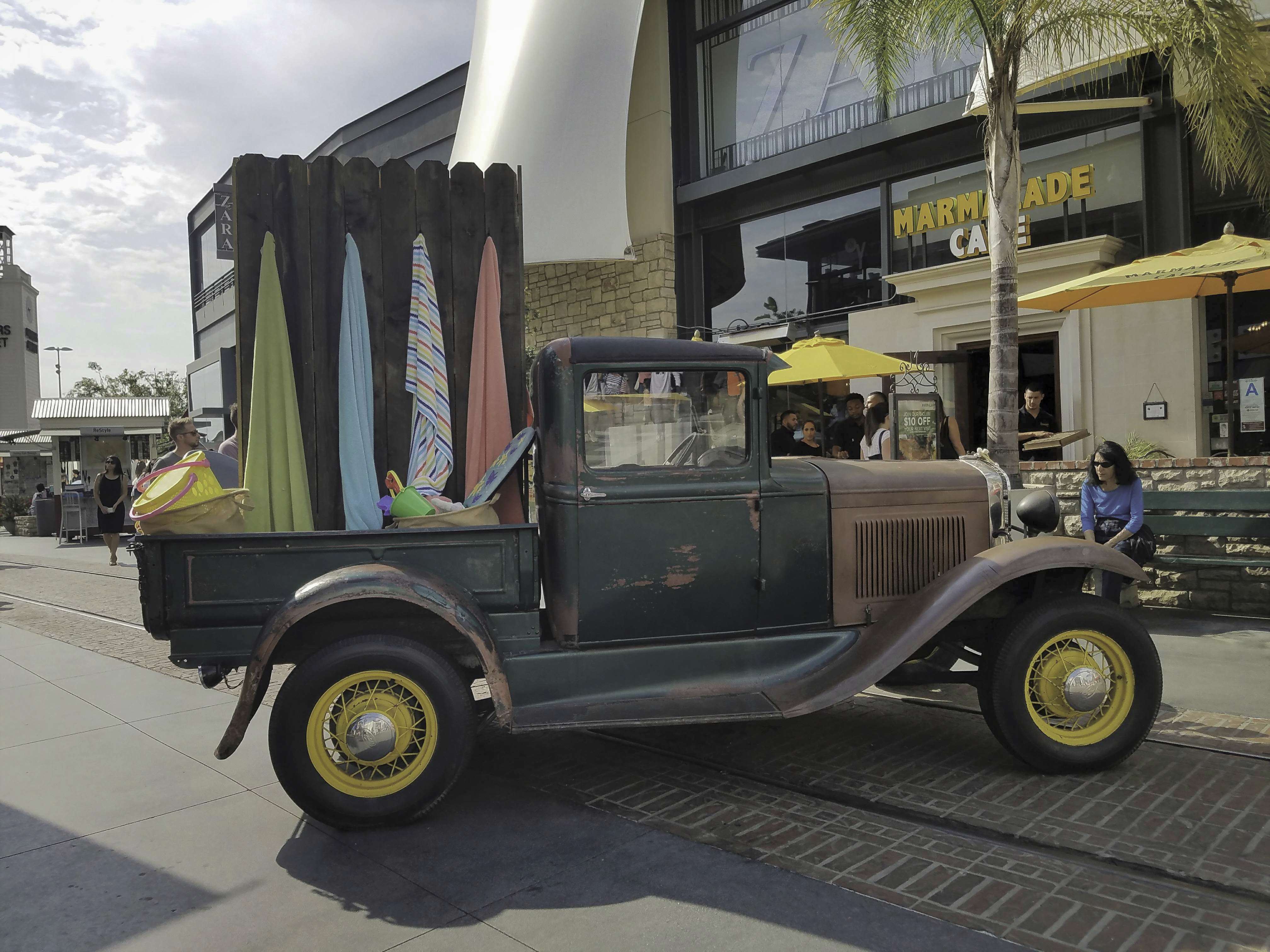 On Anacapa Street, attracted by the curvy beauty of this building which, incredibly, is a parking lot. All straight toward the beach and the Chase Palm Park, lined with rows of palm trees as far as the eye can see. And a faraway look at Stearns Wharf; we walked the other way, keeping our distance.