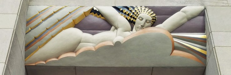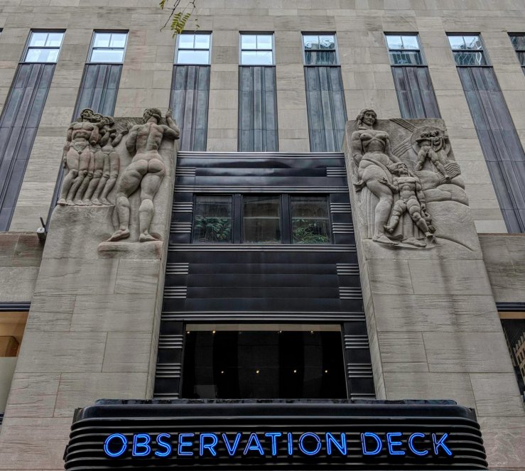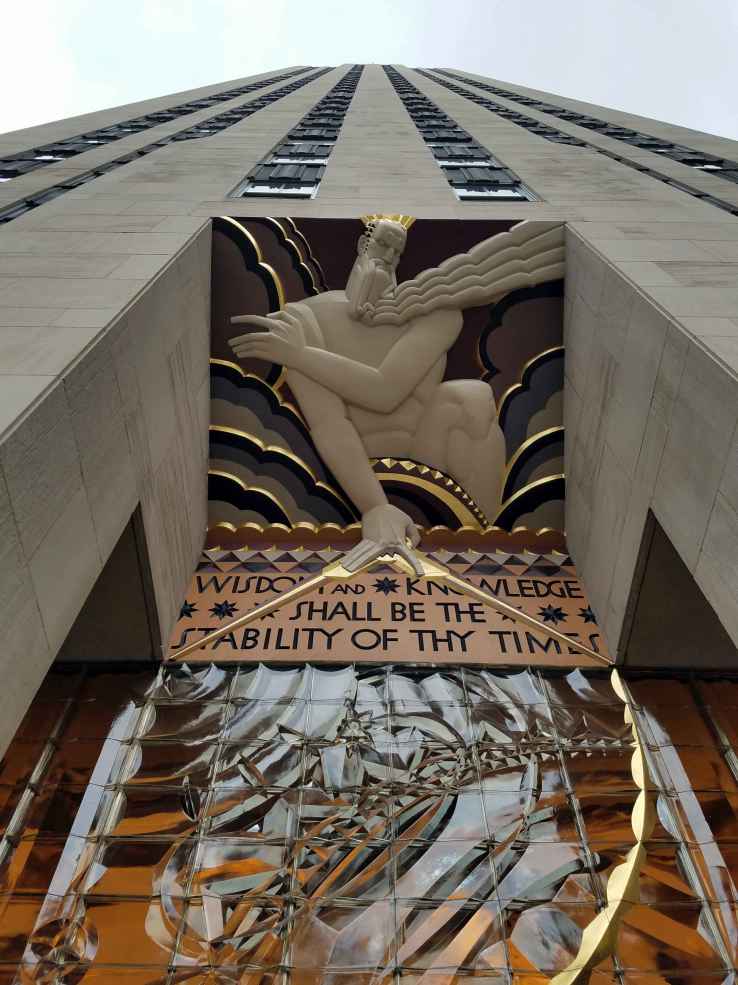 ”Soaring above the entrance to 50 Rockefeller Plaza, this dynamic plaque symbolizes the business of the building’s former tenant, the Associated Press.”