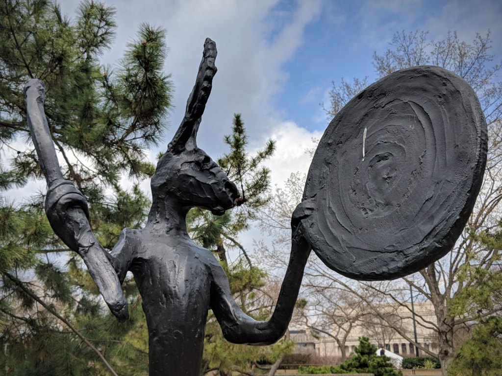 ”Flavin’s work generates ambient light that reaches into the viewer’s space. The form, resembling a skyscraper, refers to a never-realized, but nonetheless influential, monument to an organization supporting Communist revolution designed by the Russian constructivist artist Vladimir Tatlin in 1920. It was to be a spiraling steel framework thirteen hundred feet tall in which rotating glass rooms would be suspended. Though utterly impractical engineering-wise, it remains an influential symbol of the artist’s efforts to combine art and technology. Flavin’s “monument,” despite its low-tech, small-scale nature, pays homage to Tatlin’s futuristic, utopian ideals.” [source: MOCA]