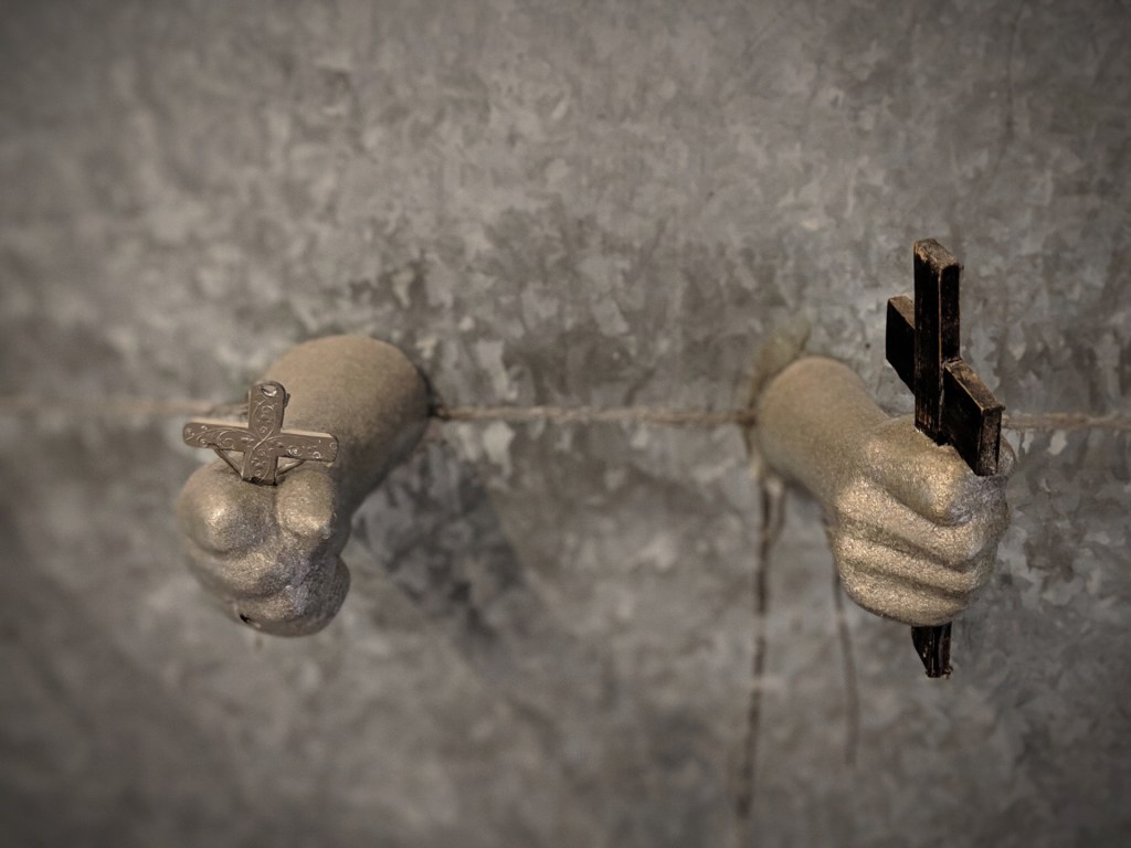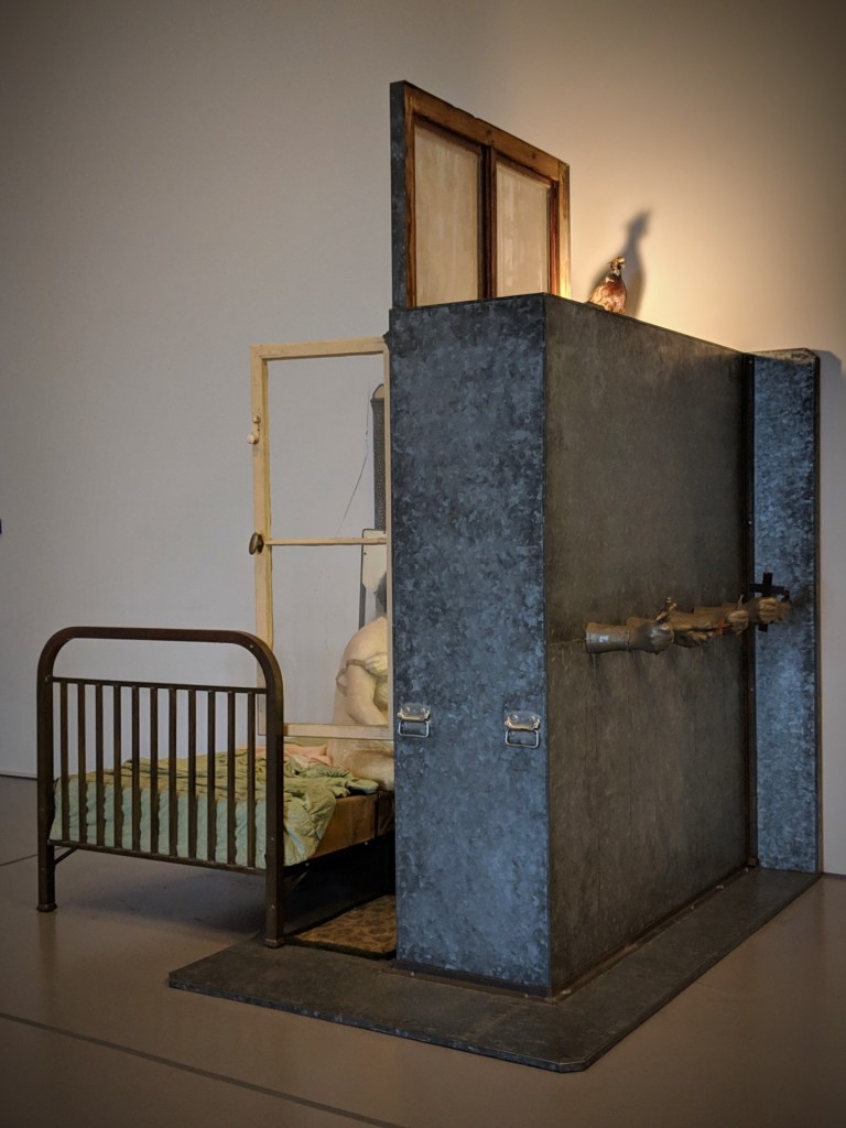One of the first collaborations between the two artists, In The Infield Was Patty Peccavi depicts a pregnant woman looking through a window lit by a high-intensity headlamp, which spirals in front of her. Described by Nancy Reddin Kienholz as addressing religious attitudes toward birth control, the woman looking into a void evokes hope, despair, and anxiety, even as she faces a future of limited choices.
