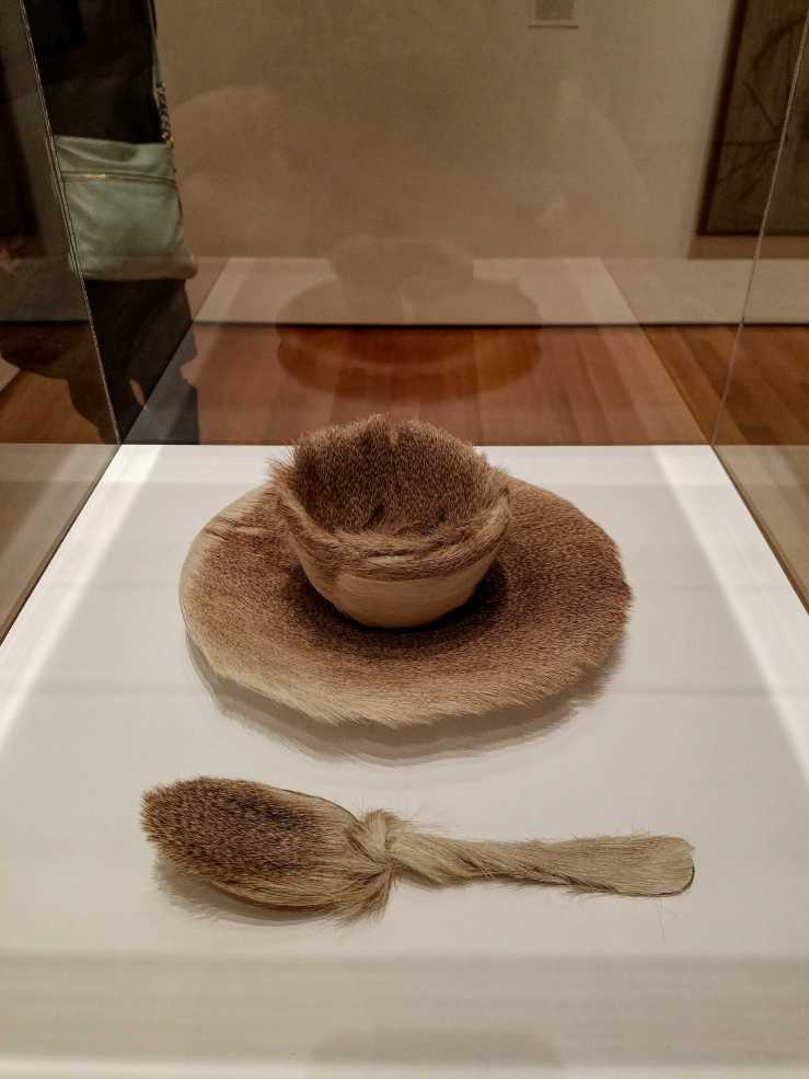 <<It began with a joke over lunch. In 1936, Meret Oppenheim was at a Paris café with Dora Maar and Pablo Picasso, who noticed the fur-lined, polished metal bracelet she was wearing and joked that anything could be covered with fur. “Even this cup and saucer,” Oppenheim replied and, carrying the merriment further, called out, “Waiter, a little more fur!” Her devilish imagination duly sparked, the artist went to a department store not long after this meal, bought a white teacup, saucer, and spoon, wrapped them in the speckled tan fur of a Chinese gazelle, and titled this ensemble Object. In doing so, she transformed items traditionally associated with decorum and feminine refinement into a confounding Surrealist sculpture. Object exemplifies the poet and founder of Surrealism André Breton’s argument that mundane things presented in unexpected ways had the power to challenge reason, to urge the inhibited and uninitiated (that is, the rest of society) to connect to their subconscious—whether they were ready for it or, more likely, not.>>