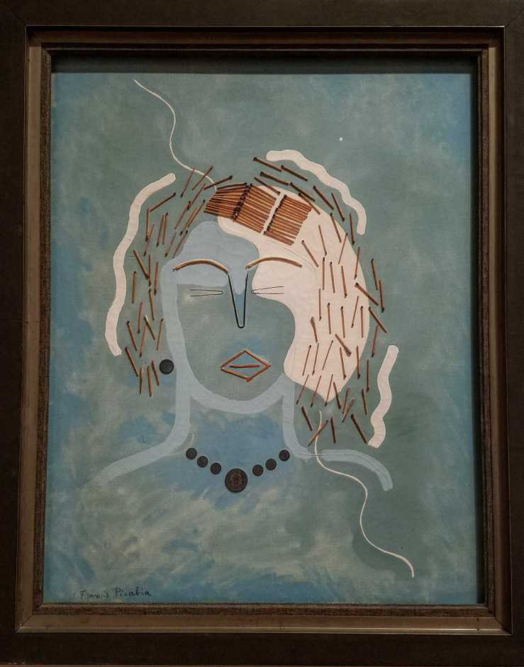 From the accompanying tag: ”This work began as a portrait of Picabia painted by the German artist Bruno Eggert in 1934. Eggert gave it to Picabia, who then added his own touches: a pair of dark-tinted glasses on his nose, a face in the lover left corner, a transparent female body across the picture, the edge of a stretcher in the upper right corner. He also signed and dated the work. Here, Picabia adopted another artist’s work as the support for his own, with over-painting used to assert rather than deny.”